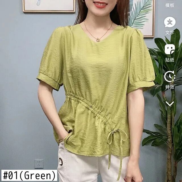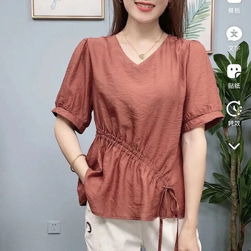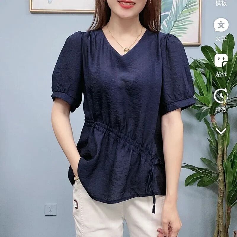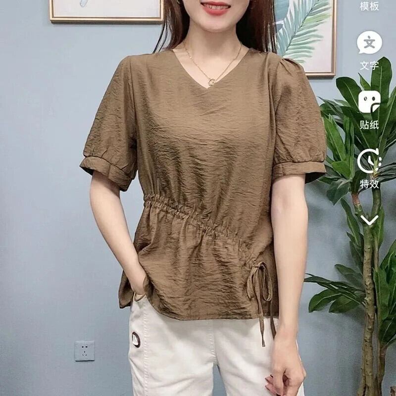 送料無料 V ネックスプライシングレースアップボウシャーリングブラウスレディース 2023 夏オーバーサイズプルオーバーパフスリーブシャツ リボン サマー 夏物 Vネック AE1288776699159364041
