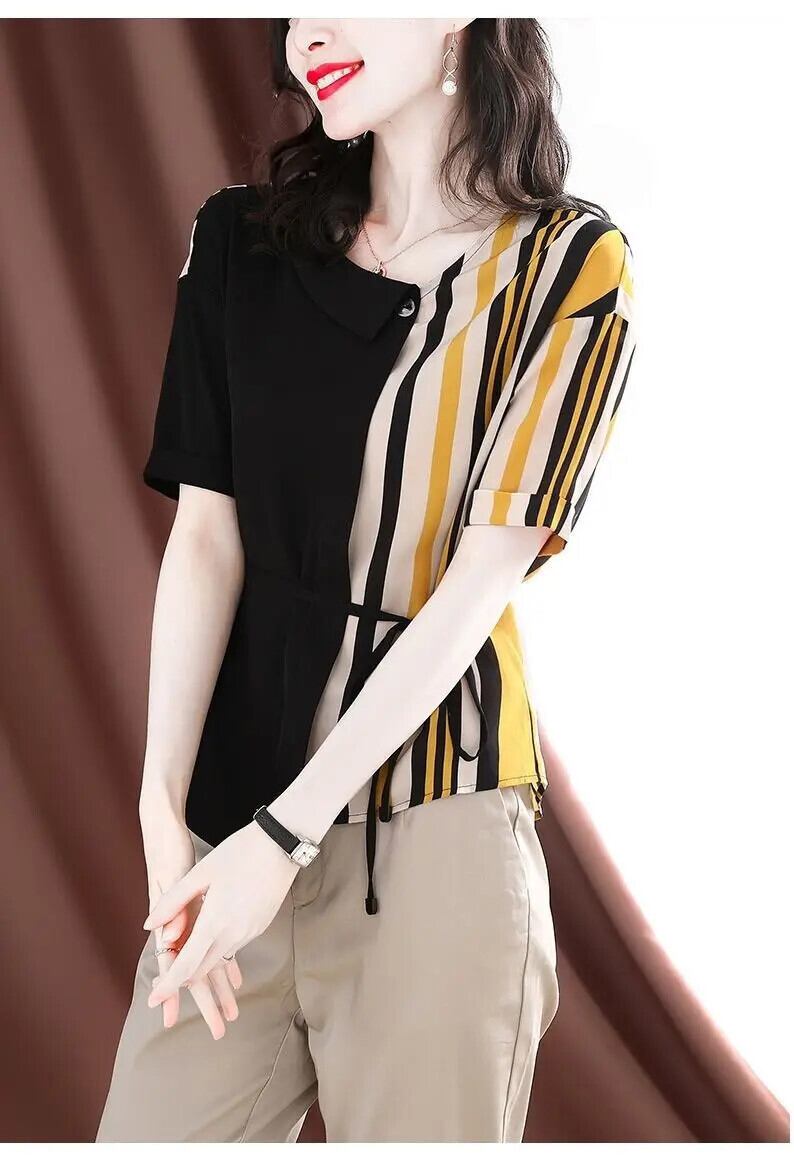 送料無料 プリントストライプスプライス包帯不規則なルーズサテンシャツ夏トップス特大非対称女性のブラウス サマー 夏物 AE1288776663498469384