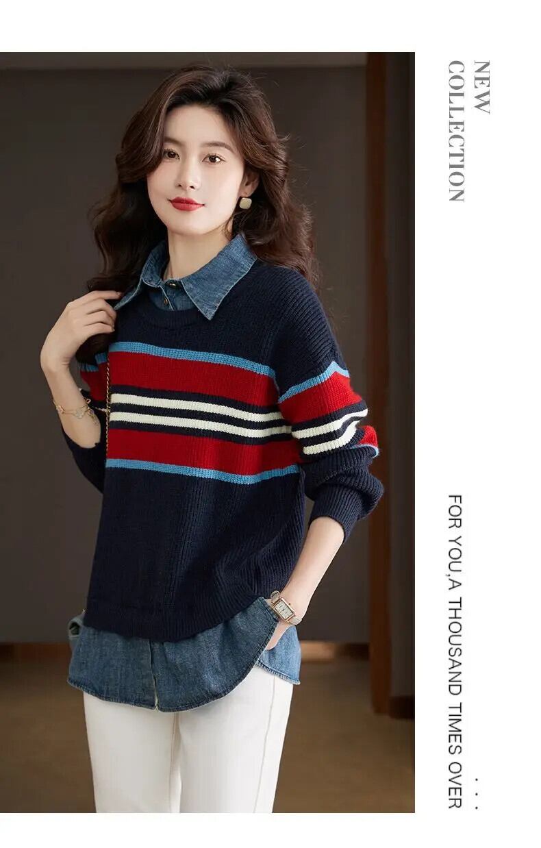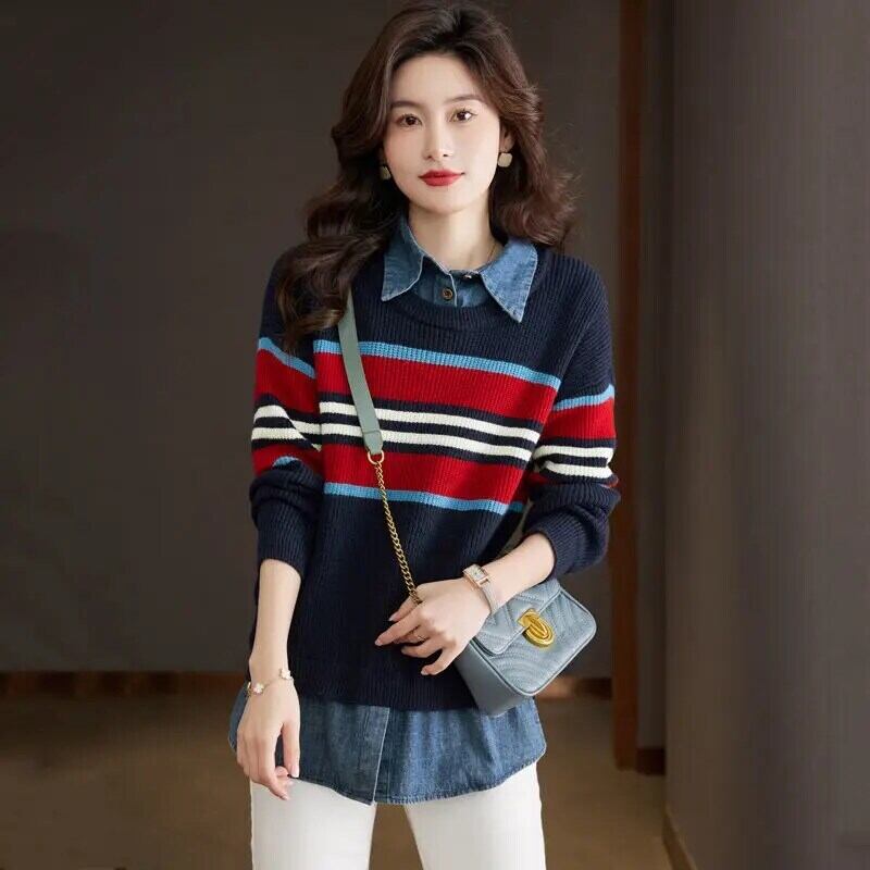 送料無料 ラペルスプライスストライプフェイクツーピースブラウス女性の 2023 秋冬ルーズ通勤トップスシャツ オータム 秋物 ウィンター 冬物 AE1288776622879341338