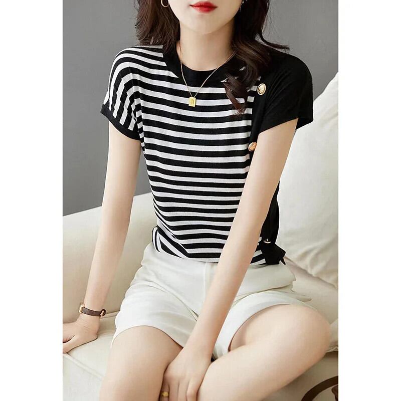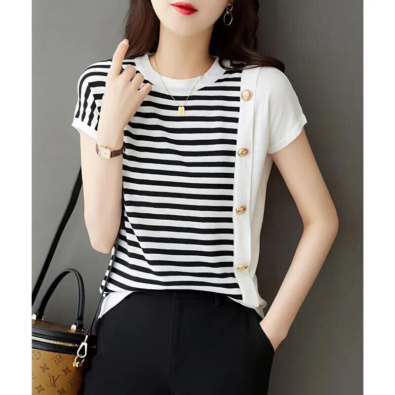 送料無料 O ネックボタンスプライスルーズストライプブラウス 2023 夏オールマッチプルオーバー非対称シャツ サマー 夏物 Oネック AE1288776658910455549