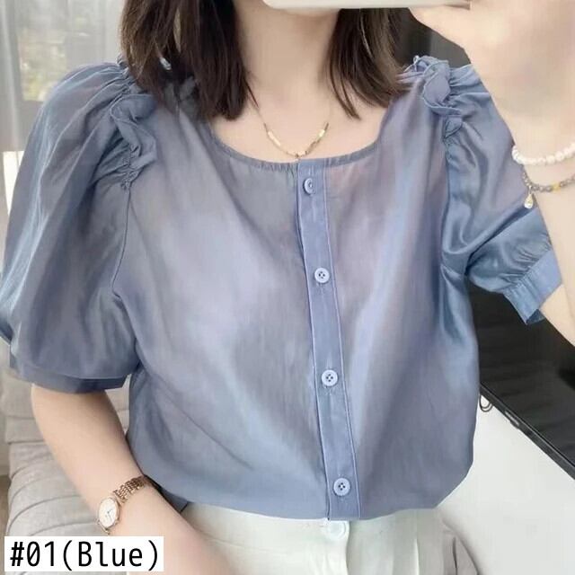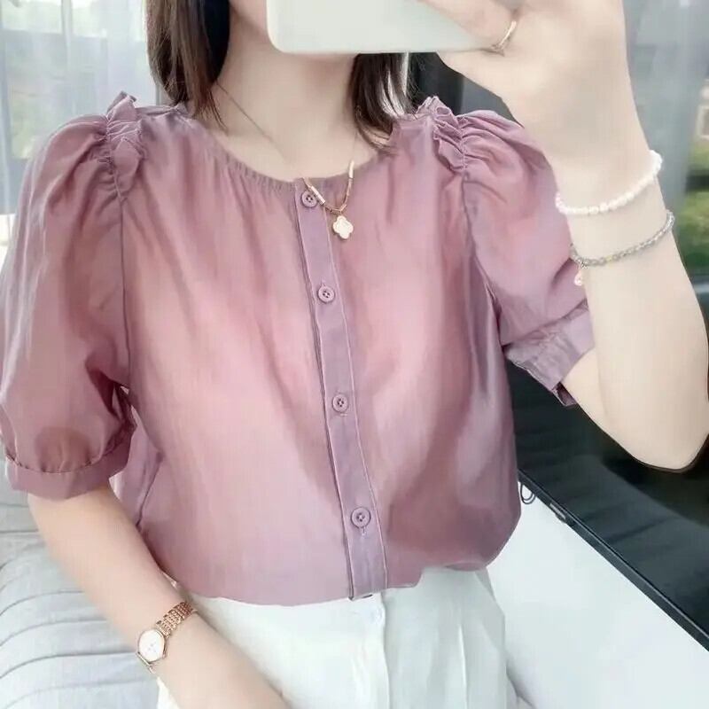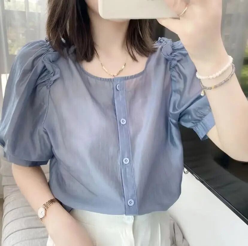 送料無料 O ネックひだフリルパフスリーブシフォンシャツ女性の 2024 夏ルーズトップスオフィスレディブラウス ラッフル サマー 夏物 Oネック 会社 学校 通勤や通学にも AE128877663279395730