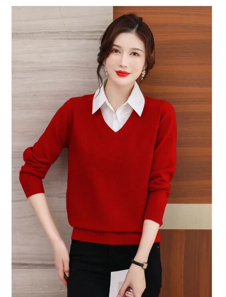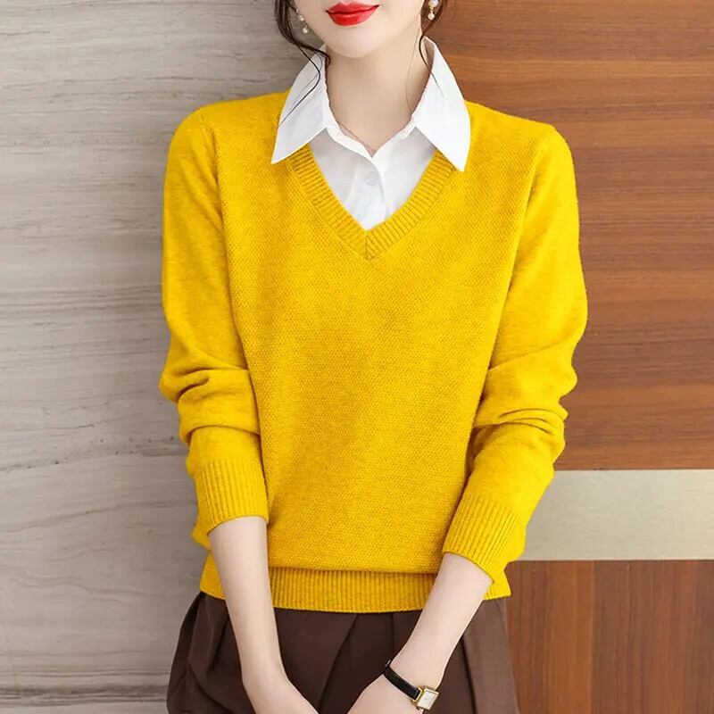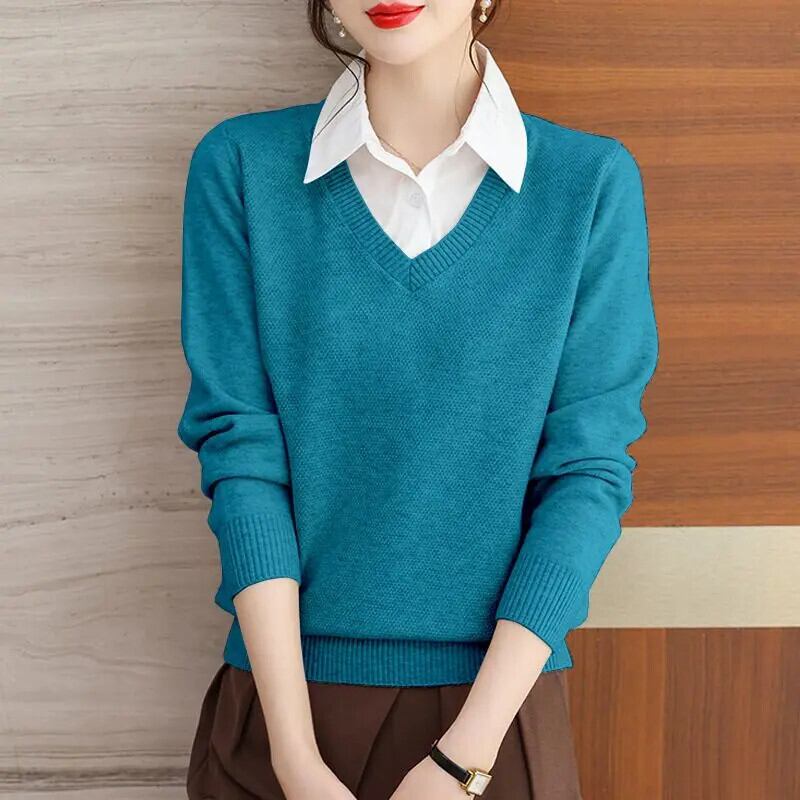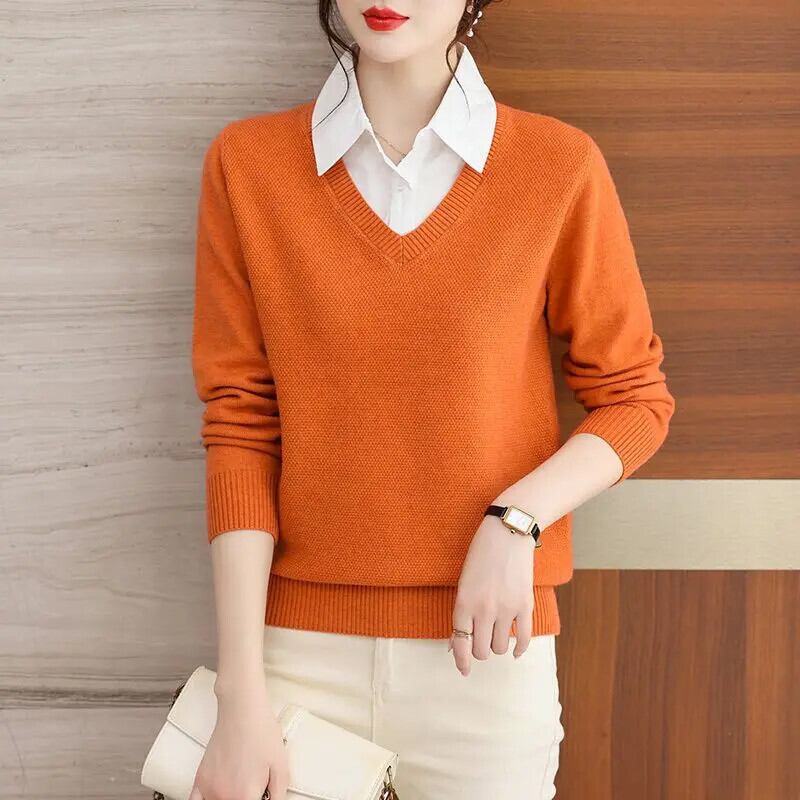送料無料 ラペルボタンスプライスフェイクツーピースブラウス女性の 2023 秋冬ルーズ通勤プルオーバーシャツ シャツ オータム 秋物 ウィンター 冬物 AE1288776670798921208