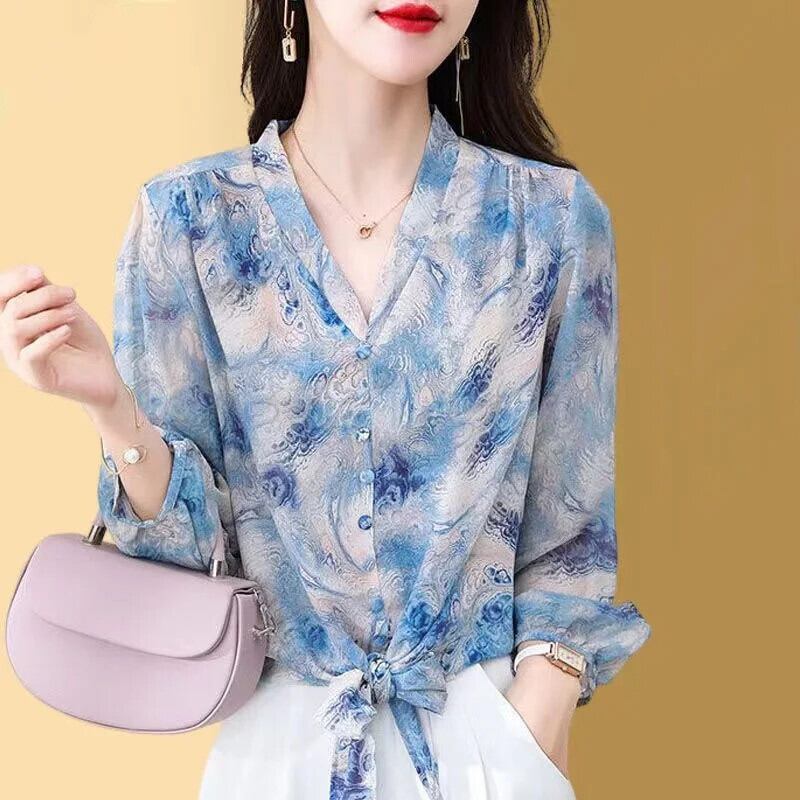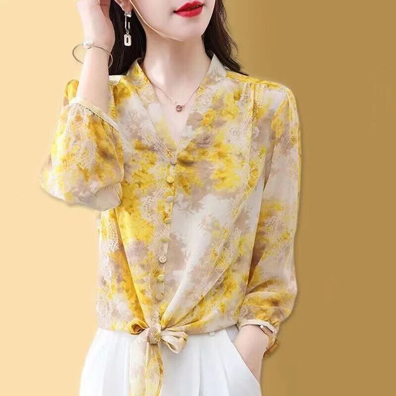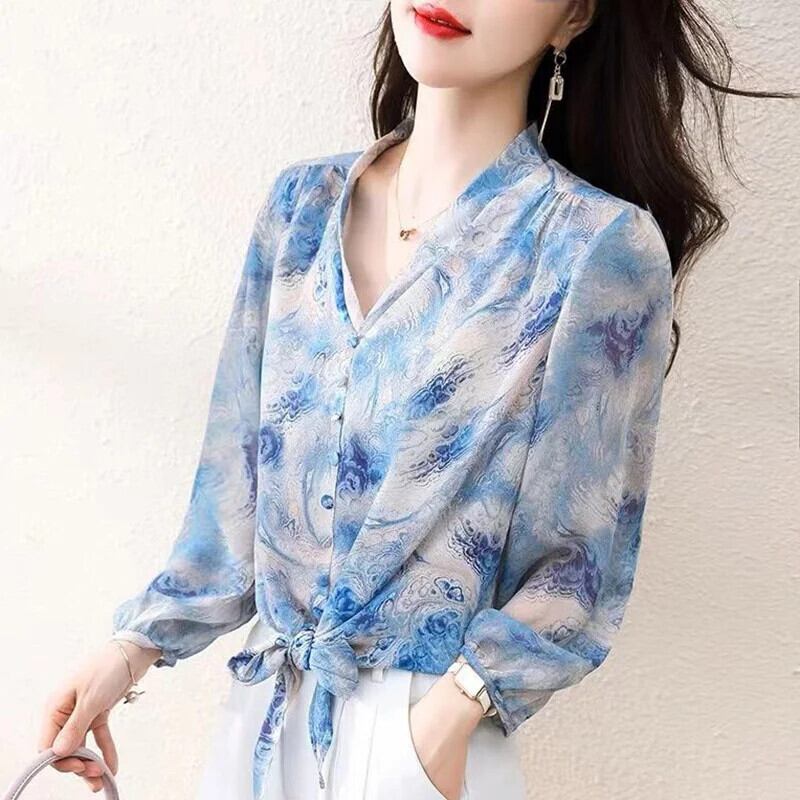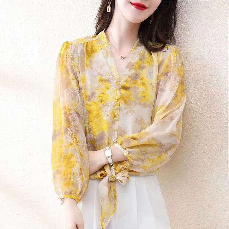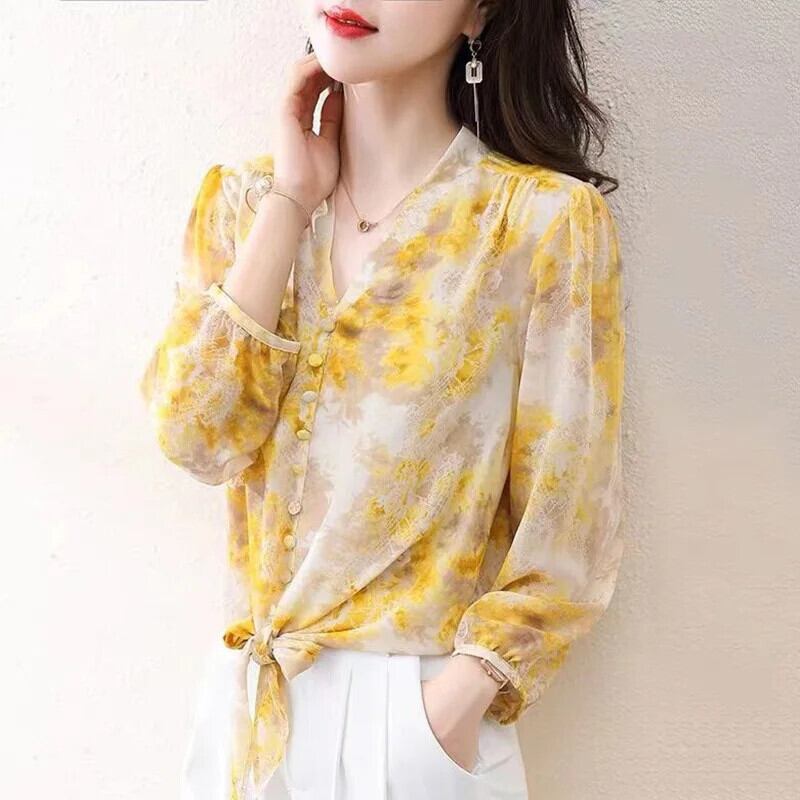 送料無料 V ネックプリントルーズひだ包帯ボウシャツ女性の 2023 秋トップスオフィスレディシフォンブラウス リボン オータム 秋物 Vネック 会社 学校 通勤や通学にも AE128877668277843460