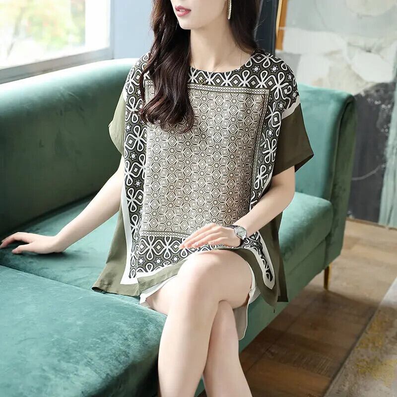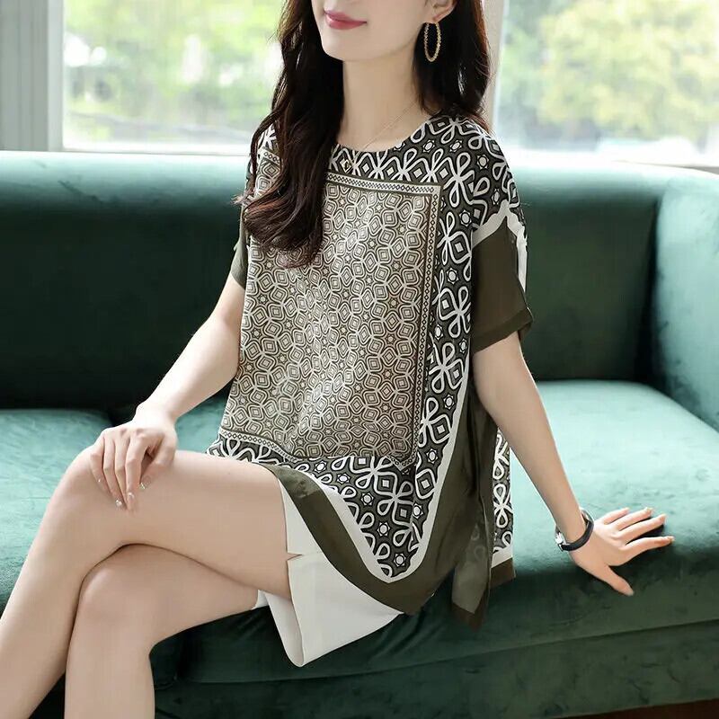 送料無料 O ネック スリット プリント バットウィング スリーブ ブラウス レディース 2023 夏 特大 プルオーバー オフィス レディー シャツ サマー 夏物 Oネック 会社 学校 通勤や通学にも AE1288776678875631357