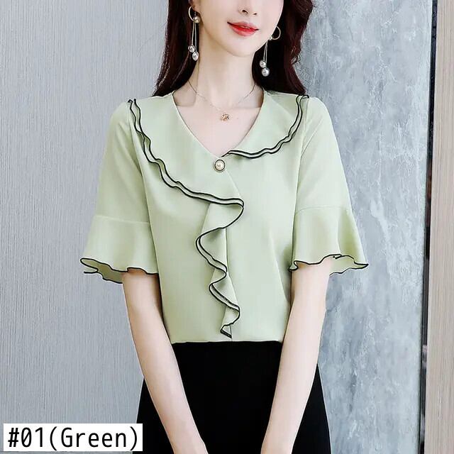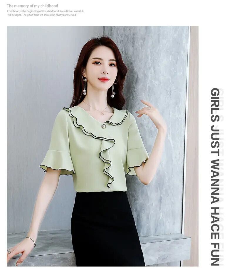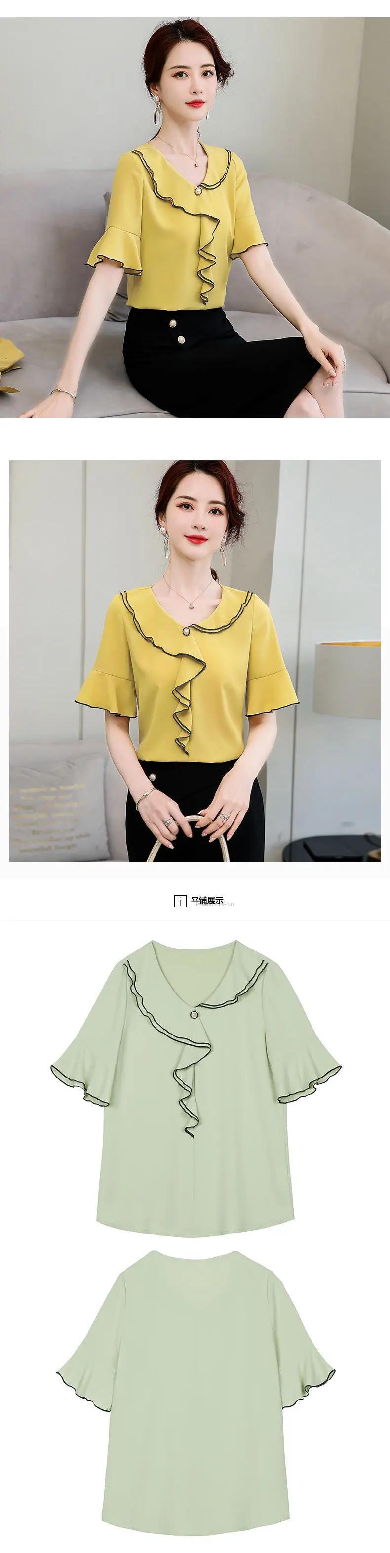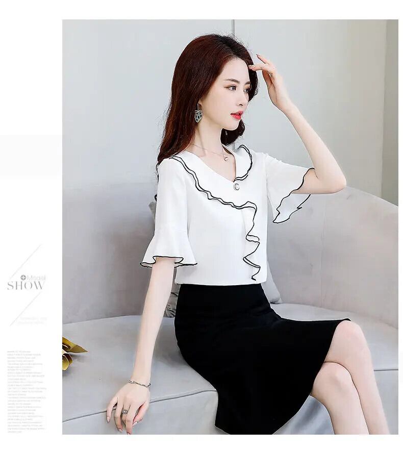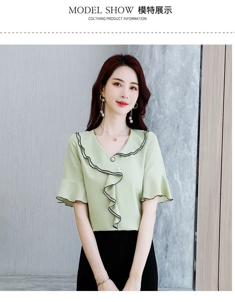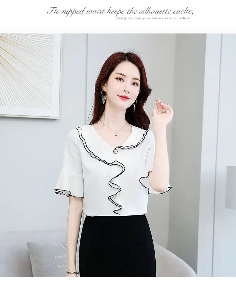 送料無料 V ネック スプライシング非対称フリル フレア スリーブ シフォン ブラウス オーバーサイズ ルーズ レディース 通勤シャツ フレアスリーブ ラッフル Vネック AE1288776628816130526