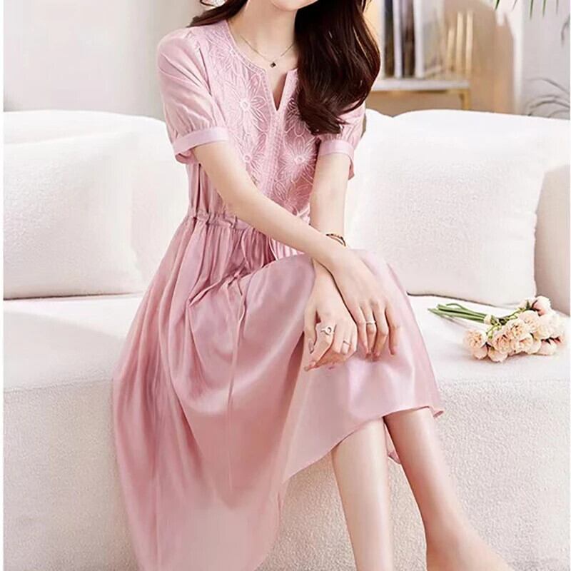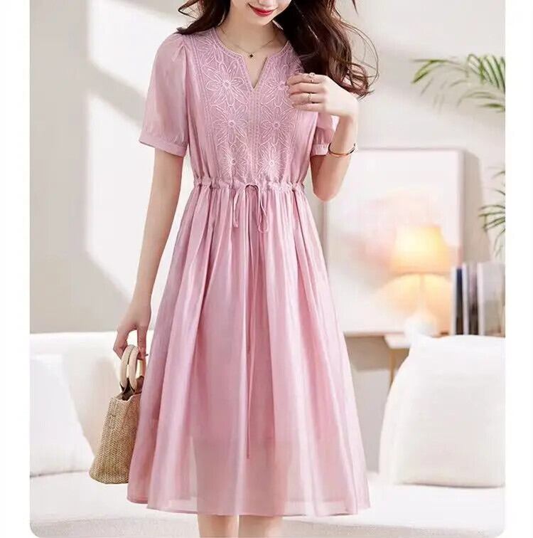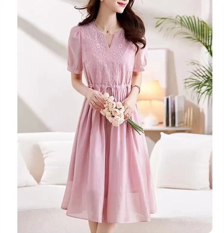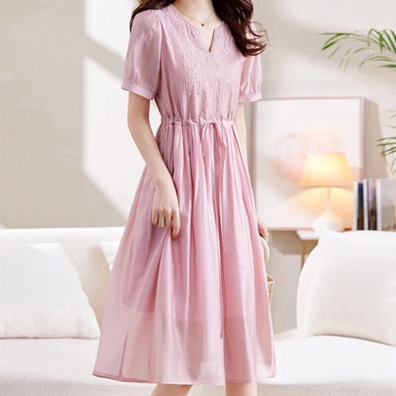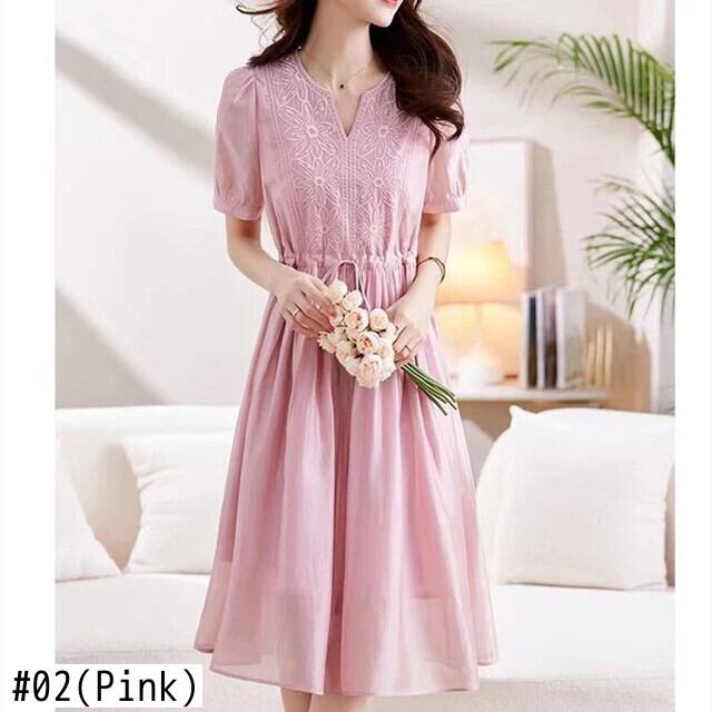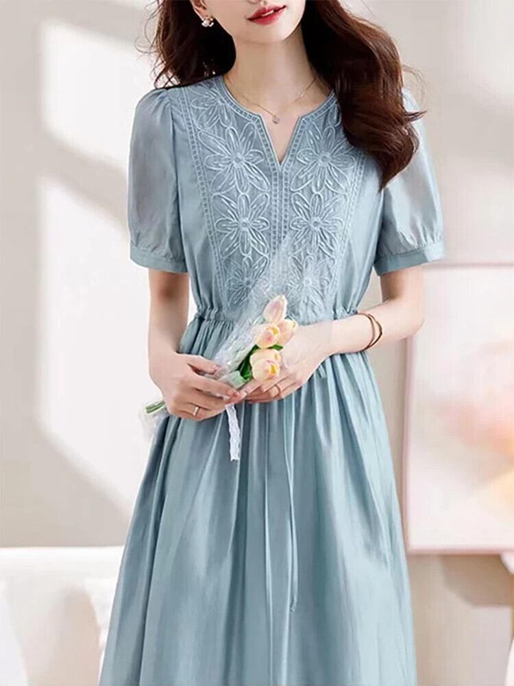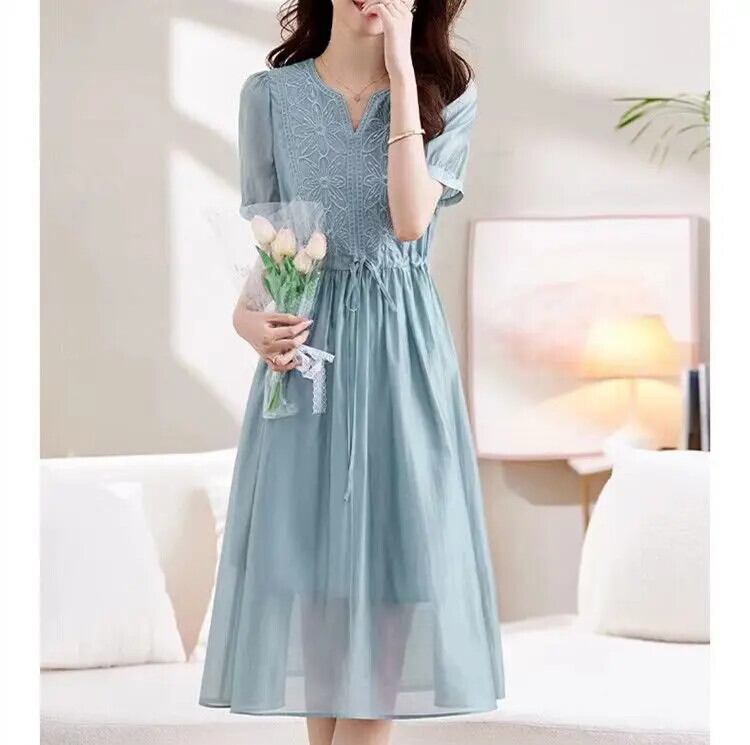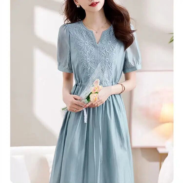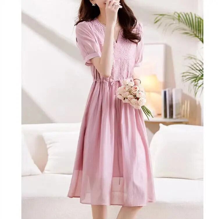 送料無料 刺繍シャーリング包帯パフスリーブパーティードレス女性 2024 夏ルーズオフィスレディ半袖ドレス ショート ハーフスリーブ サマー 夏物 会社 学校 通勤や通学にも AE1288776660137057901