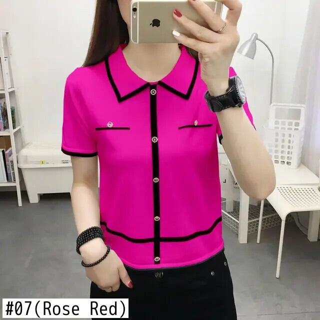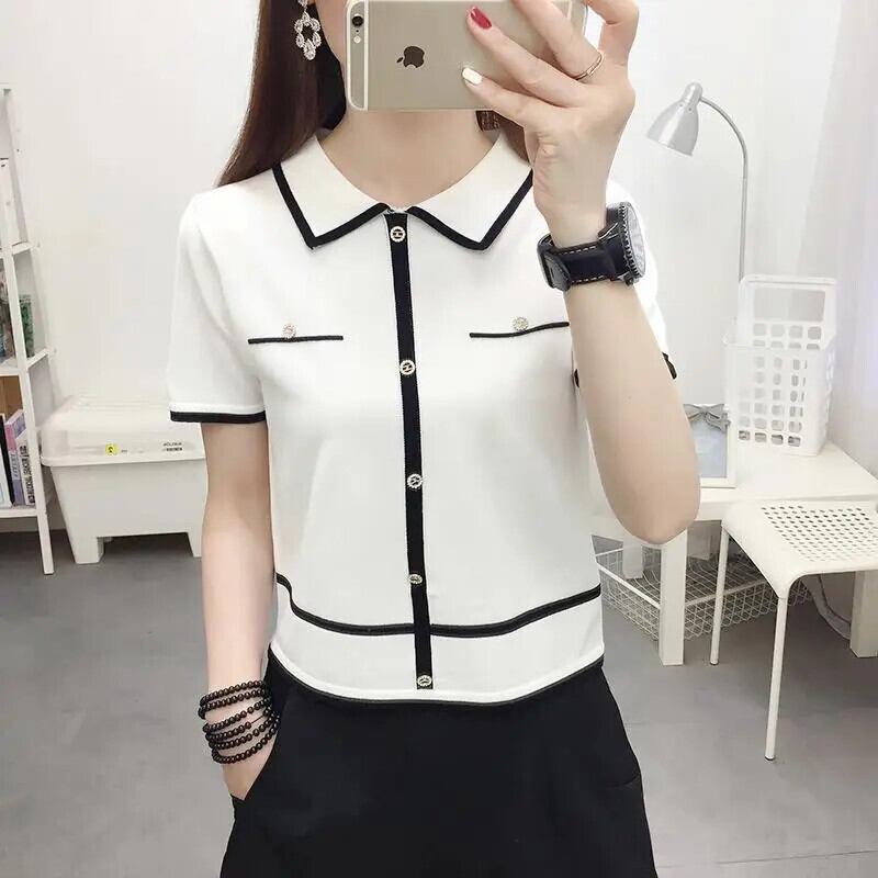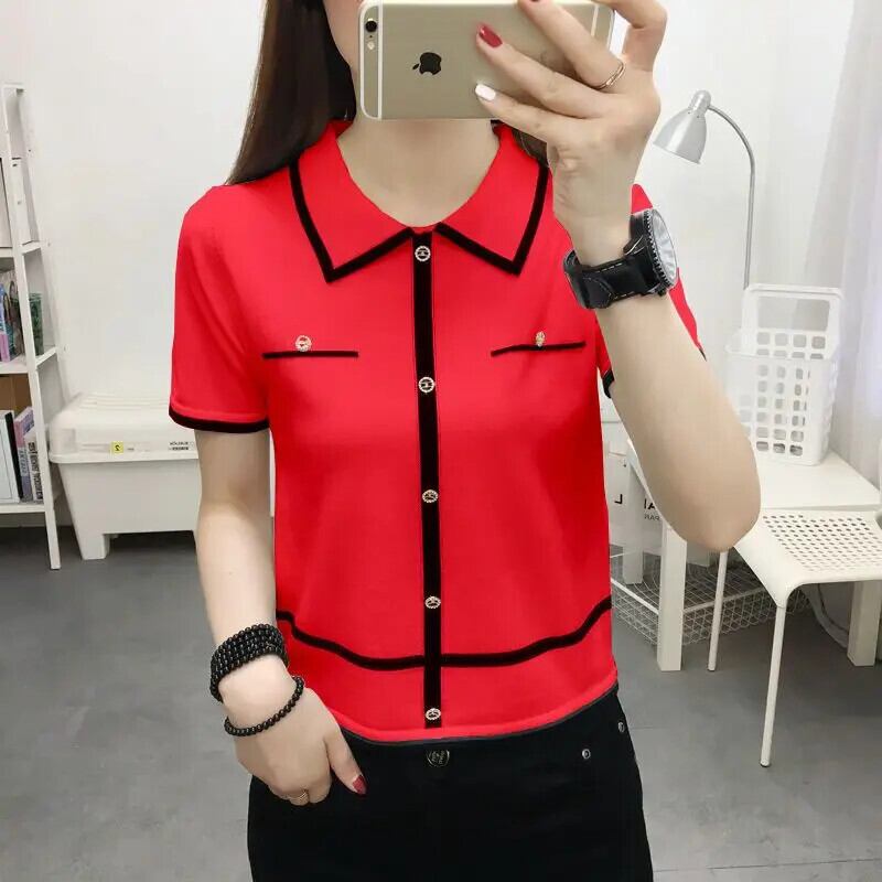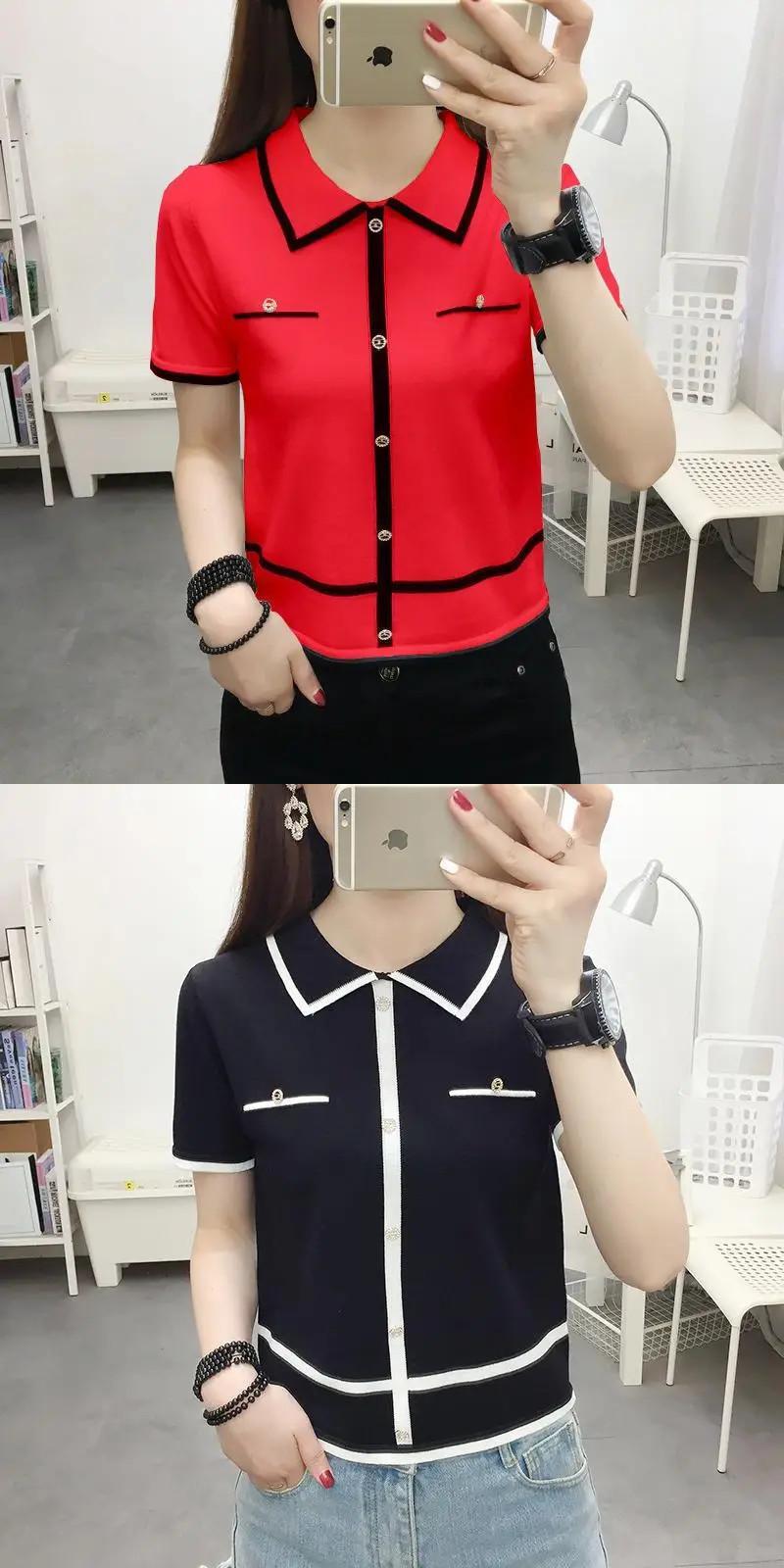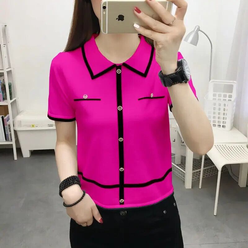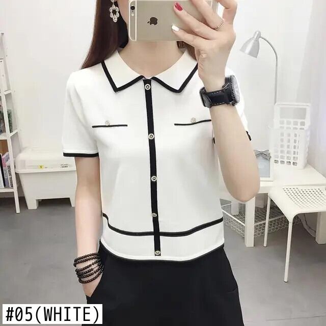 送料無料 ルーズニットボタンスプライスブラウス女性の2023夏プルオーバーオールマッチ通勤シャツ サマー 夏物 AE1288776624236916042