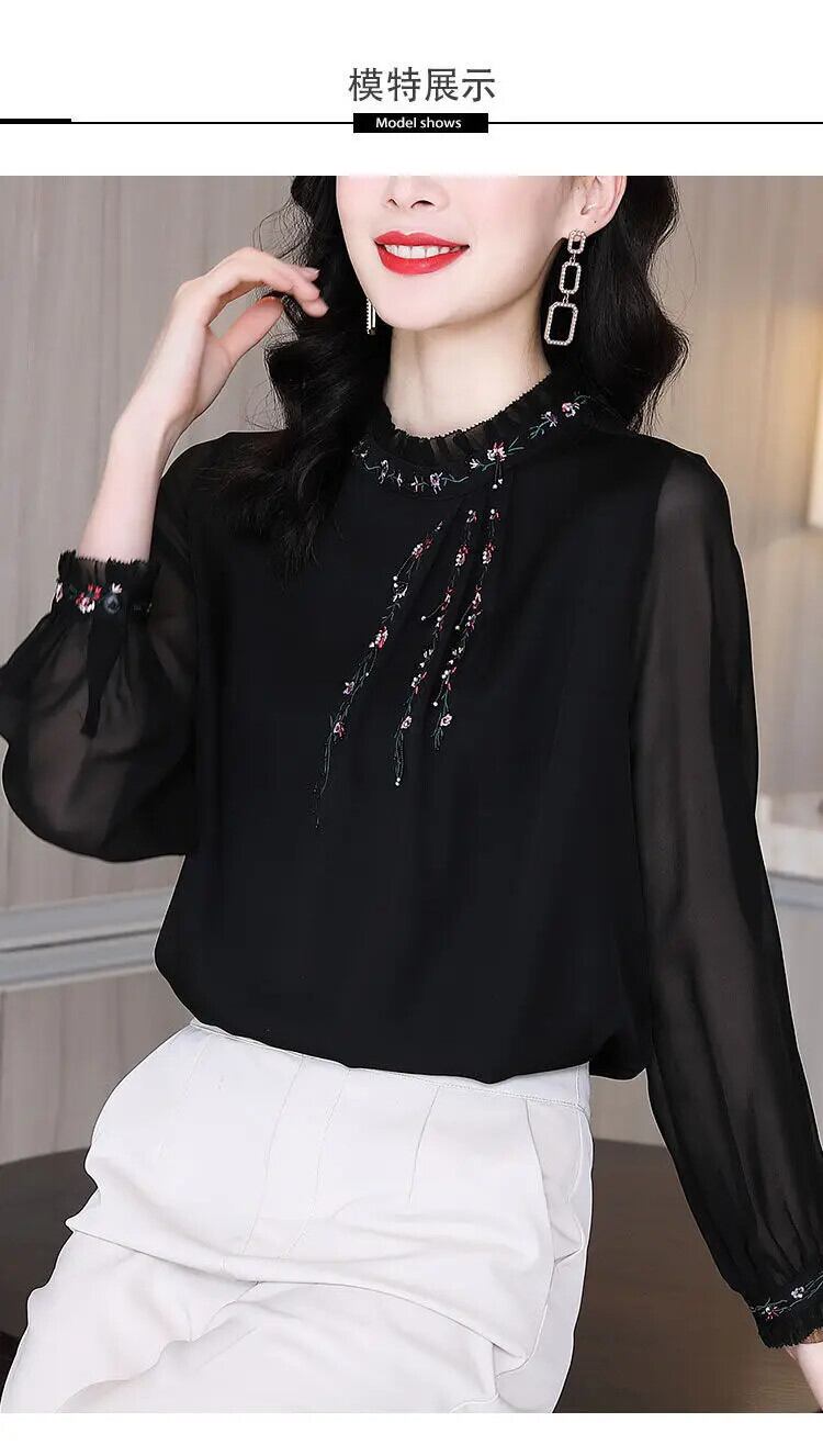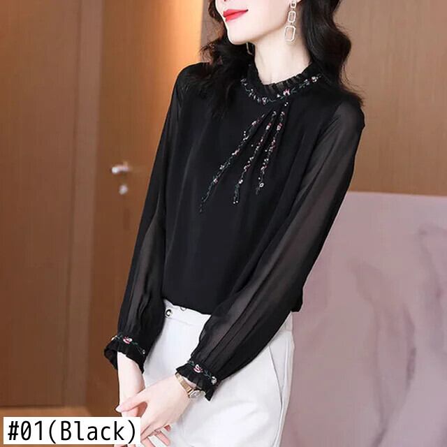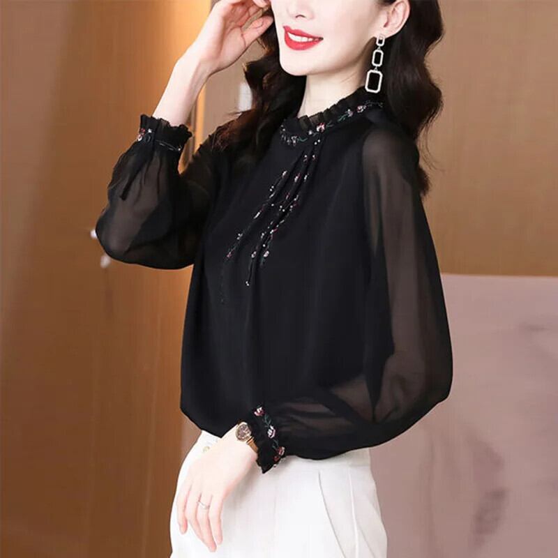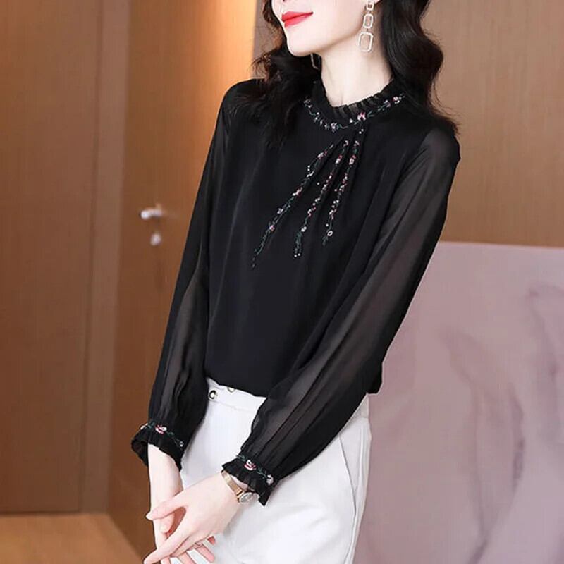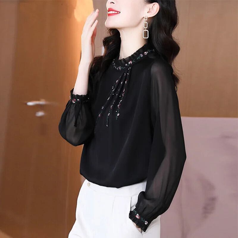 送料無料 ソリッドカラールーズフリル刺繍ブラウス 2022 秋トップス特大オールマッチ通勤女性のシャツ ラッフル オータム 秋物 AE1288776689575080294