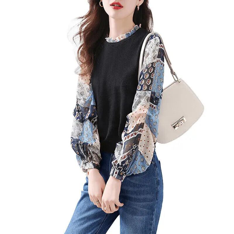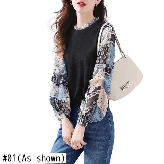 送料無料 ヴィンテージプリントスプライシングフリルネックランタンスリーブ特大シフォンシャツプルオーバー通勤女性ブラウス2022 ビンテージ AE1288776628754225510