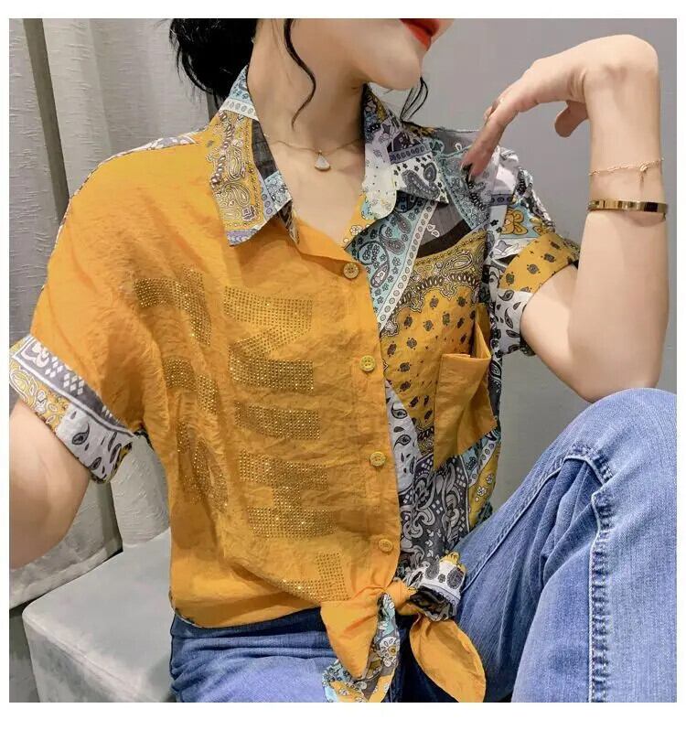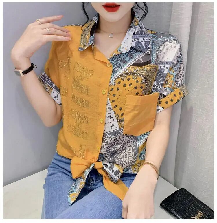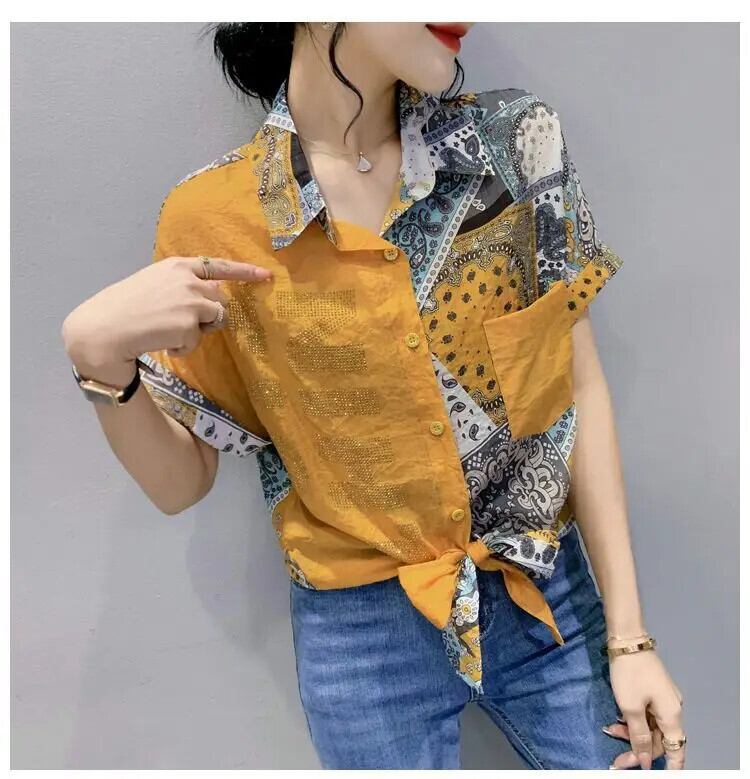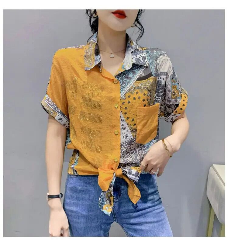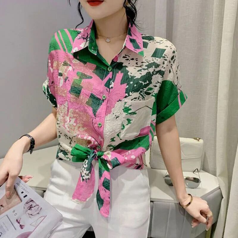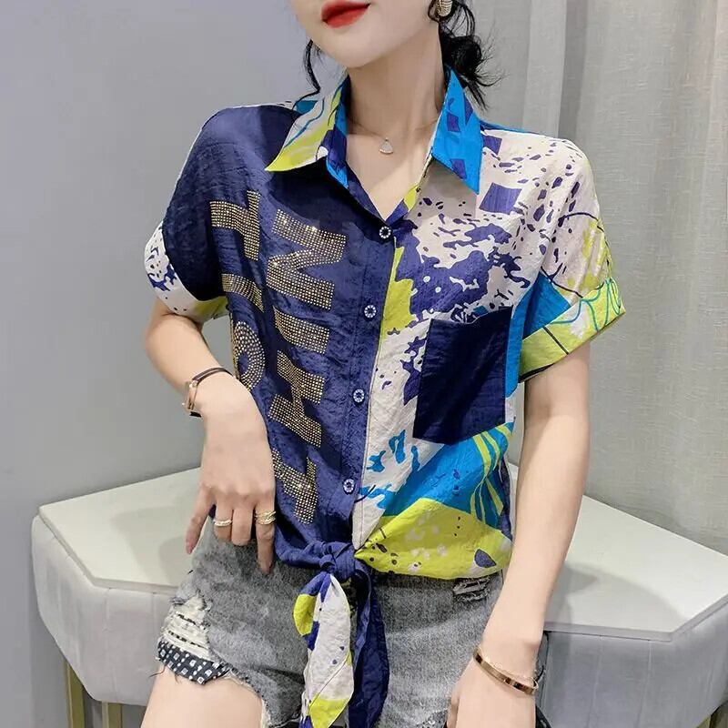 送料無料 プリントポケット不規則な包帯ボウシャツ女性の 2023 夏トップスダイヤモンドブラウス リボン サマー 夏物 AE1288776659092885183