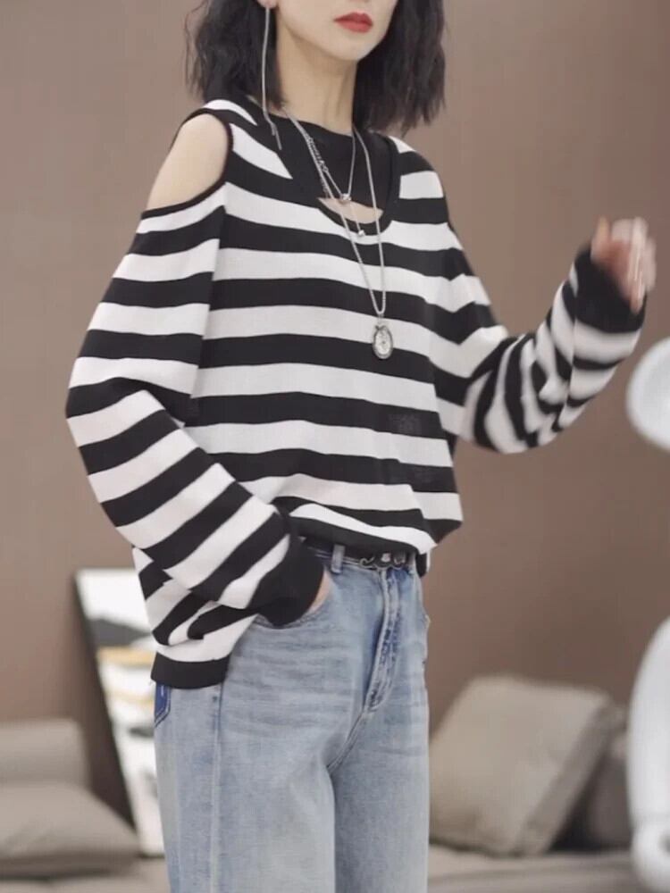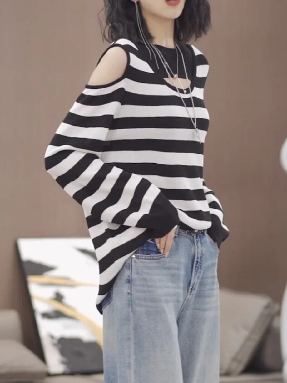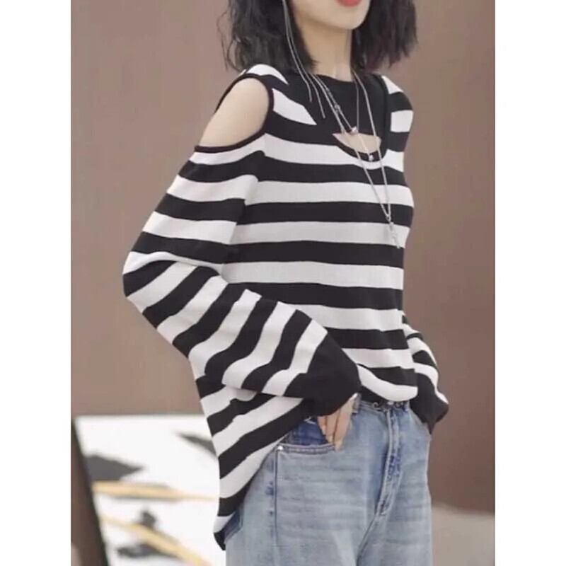 送料無料 O ネックスプライシング中空アウトオフショルダーブラウス女性の 2024 春ルーズオールマッチトップスシャツ スプリング 春物 Oネック AE1288776697516021815