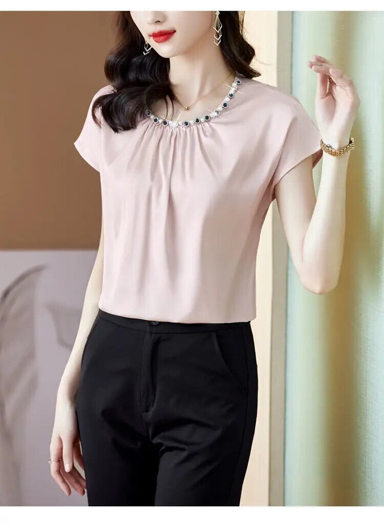 送料無料 O ネックひだ半袖ビーズサテンブラウス女性の 2023 夏プルオーバーオフィスレディシャツ ショート ハーフスリーブ サマー 夏物 Oネック 会社 学校 通勤や通学にも AE1288776698863944738