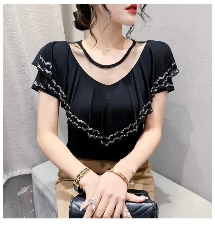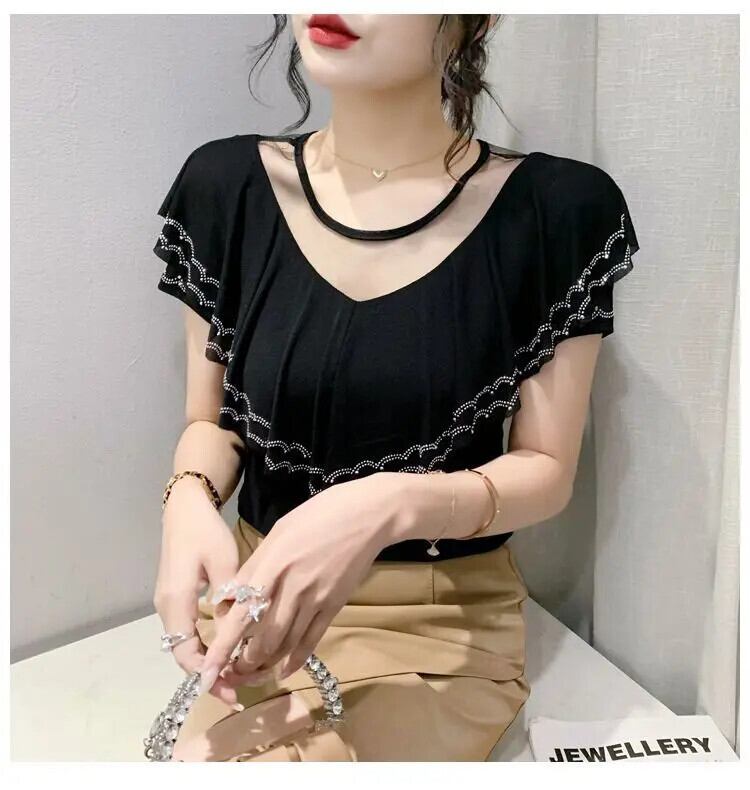 送料無料 スプライシングガーゼ中空アウトダイヤモンドフリルブラウス女性の 2023 夏プルオーバーオフィスレディシャツ ラッフル サマー 夏物 会社 学校 通勤や通学にも AE1288776647913475576
