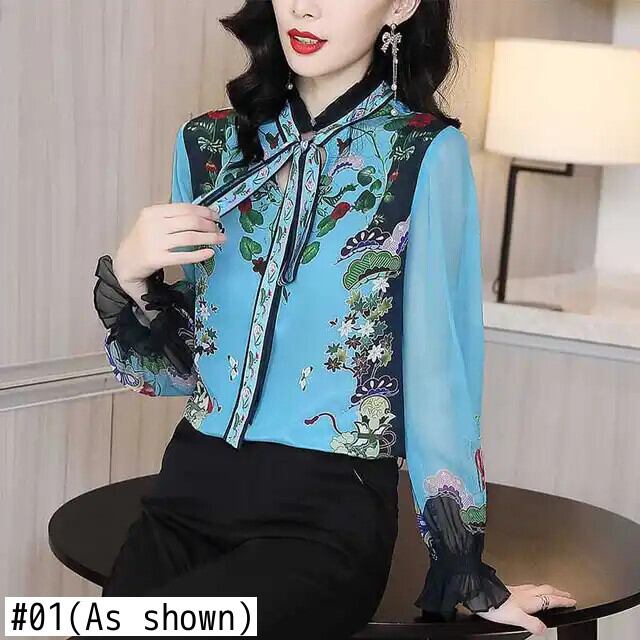 送料無料 ヴィンテージプリントスプライシングレースアップリボンフリルブラウス女性の 2022 秋プルオーバーオールマッチオフィスレディシャツ ラッフル オータム 秋物 ビンテージ 会社 学校 通勤や通学にも AE1288776640182816433
