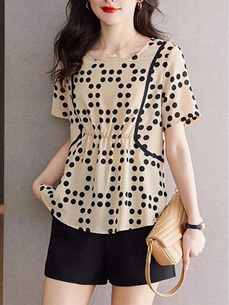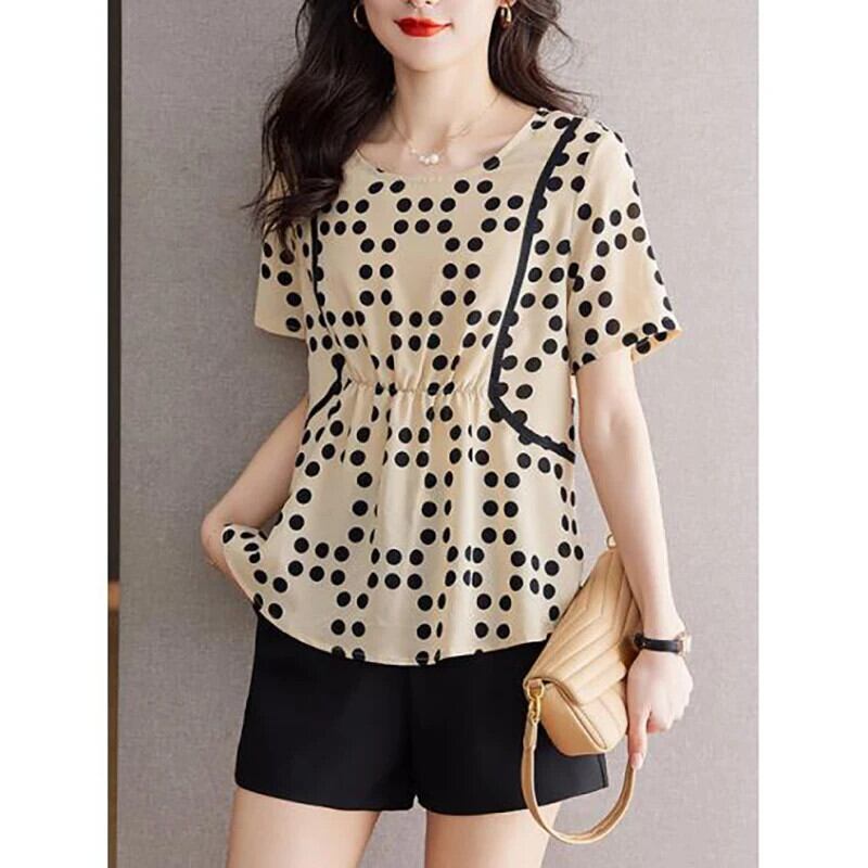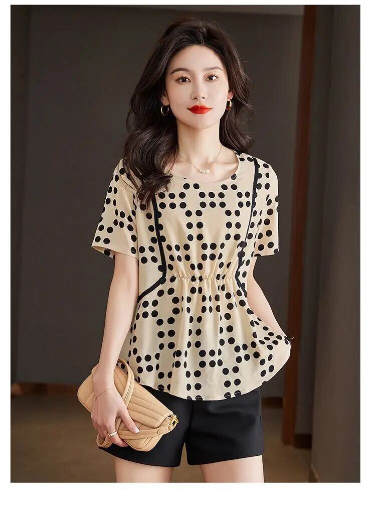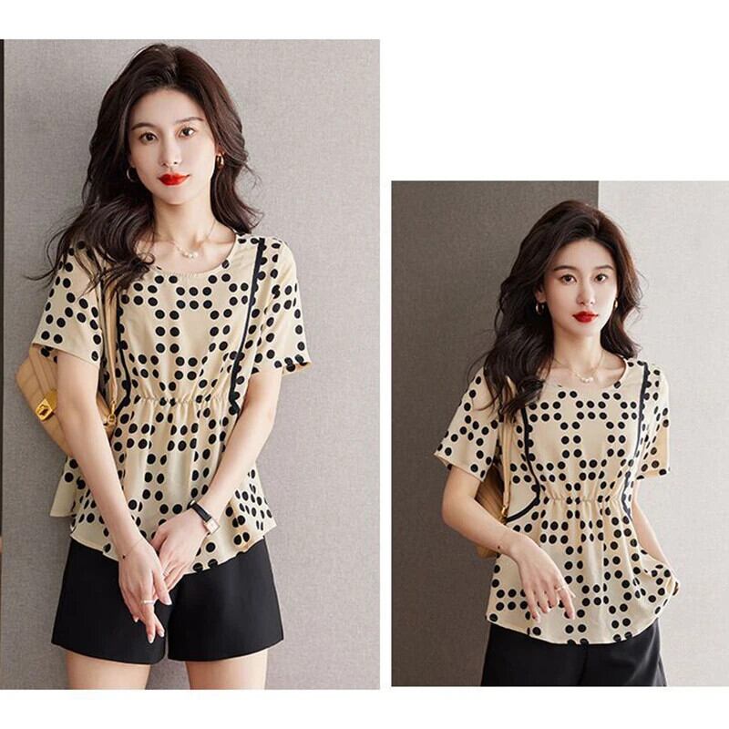 送料無料 O ネックスプライシングひだポルカドットシフォンブラウス女性の 2024 夏ルーズシックなトップスオフィスレディシャツ サマー 夏物 Oネック 会社 学校 通勤や通学にも AE1288776643166965478