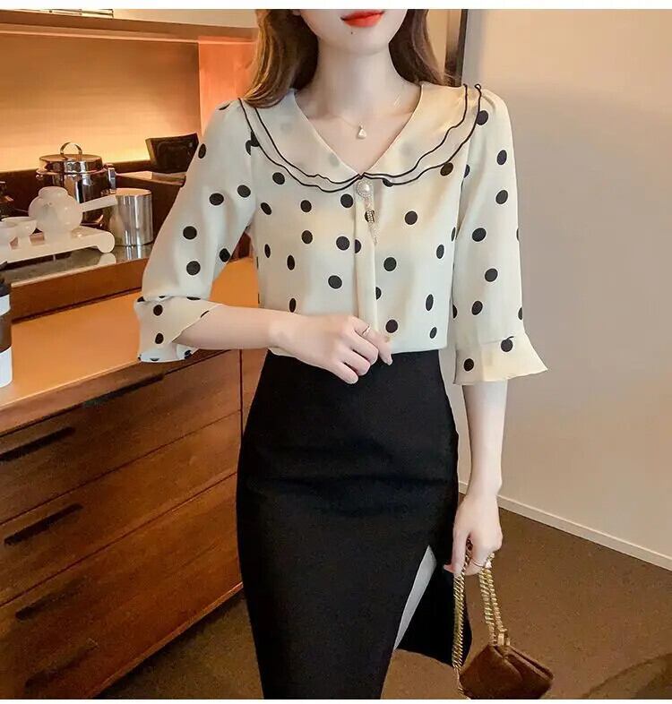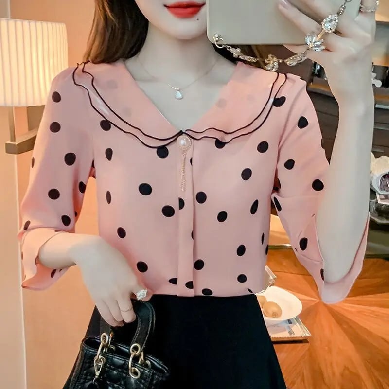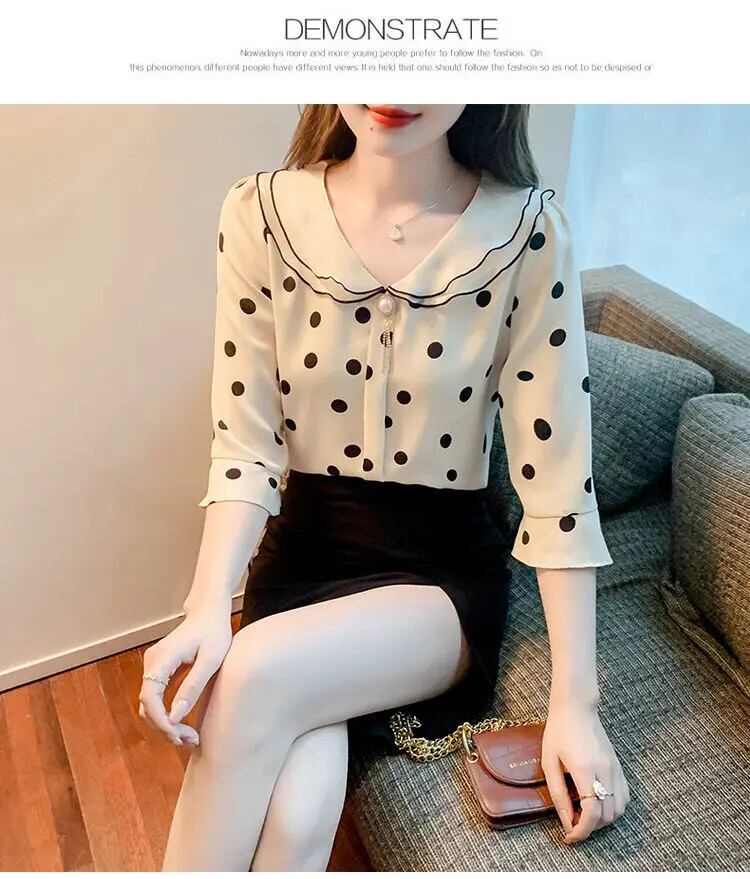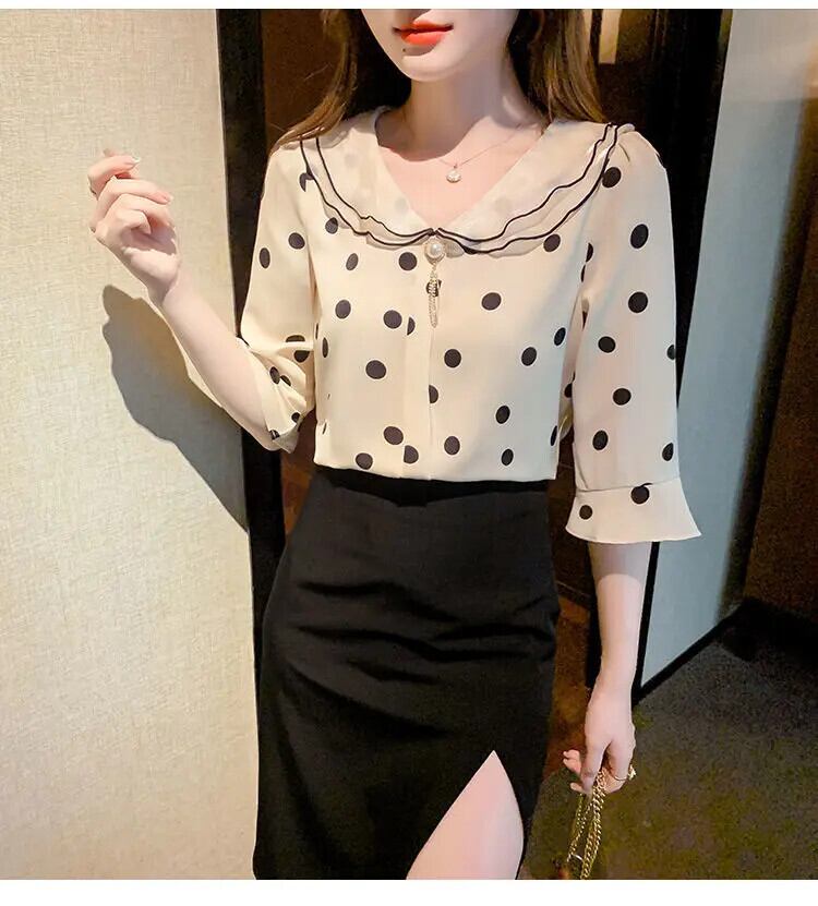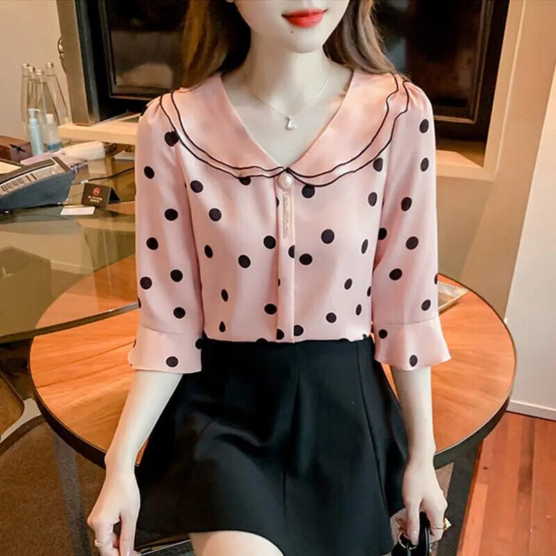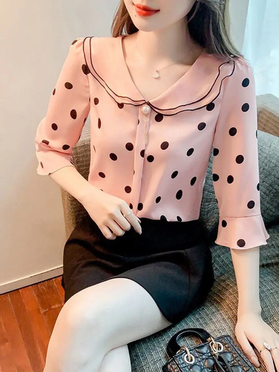 送料無料 甘いピーターパン襟プリントフレアスリーブ水玉ブラウス女性 2023 夏特大トップスビーズシャツ 大人ガーリー スウィート キュート カジュアル サマー 夏物 AE1288776688603070714
