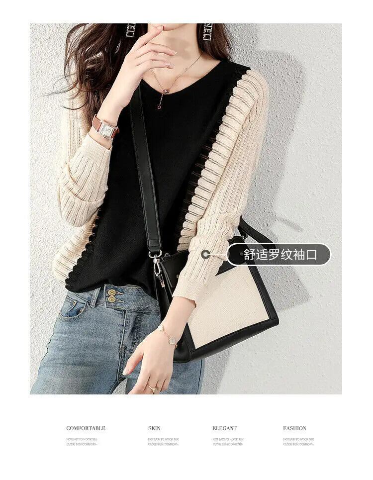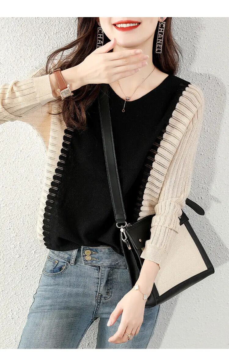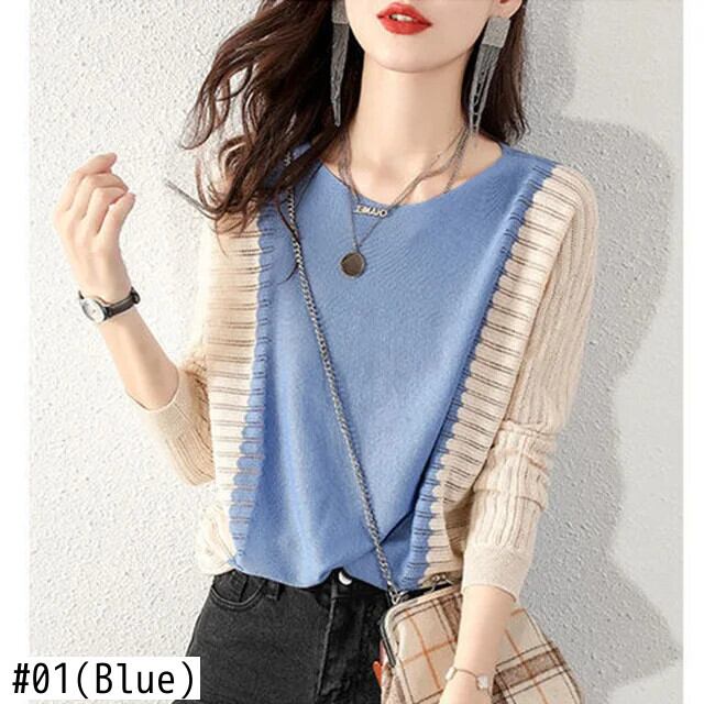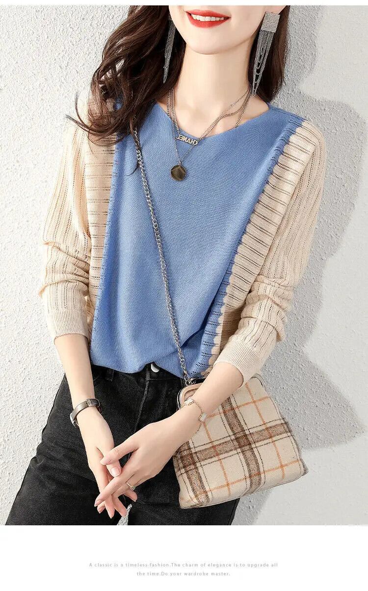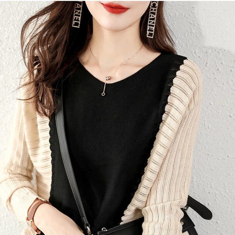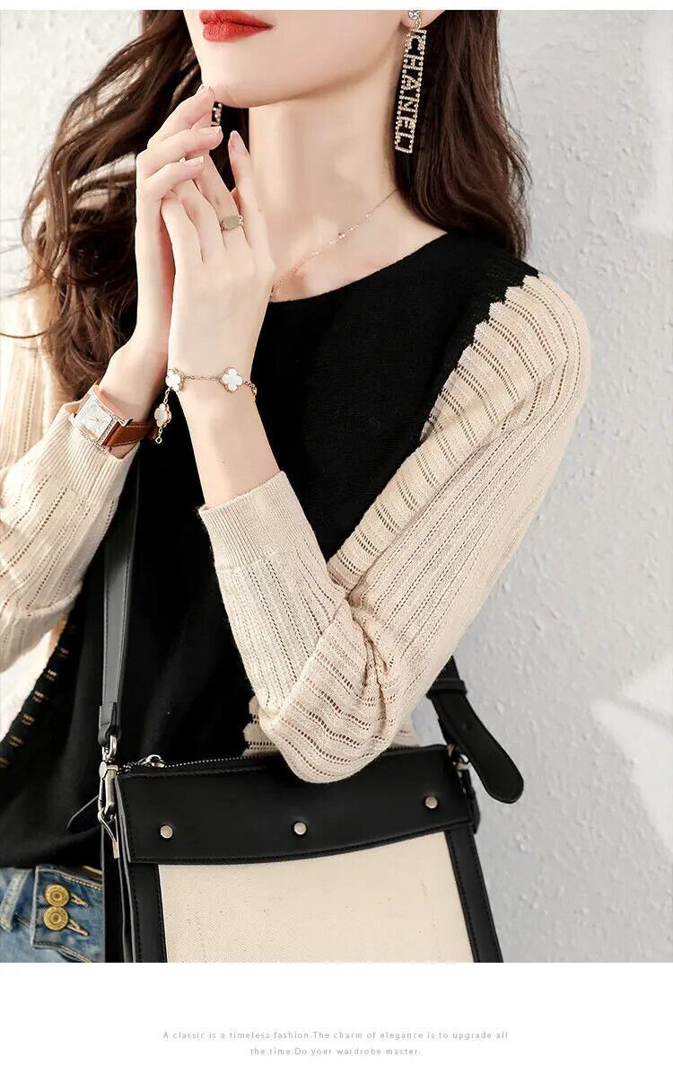 送料無料 スプライス長袖ルーズニット中空アウトブラウス2022秋プルオーバールーズ通勤シャツ ロング オータム 秋物 AE1288776619033732460