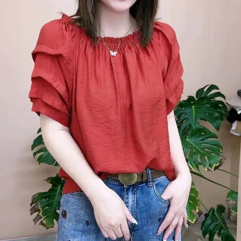 送料無料 O ネックソリッドカラーひだパフスリーブブラウス女性の 2024 夏ルーズオールマッチトップスシャツ サマー 夏物 Oネック AE1288776698319310203