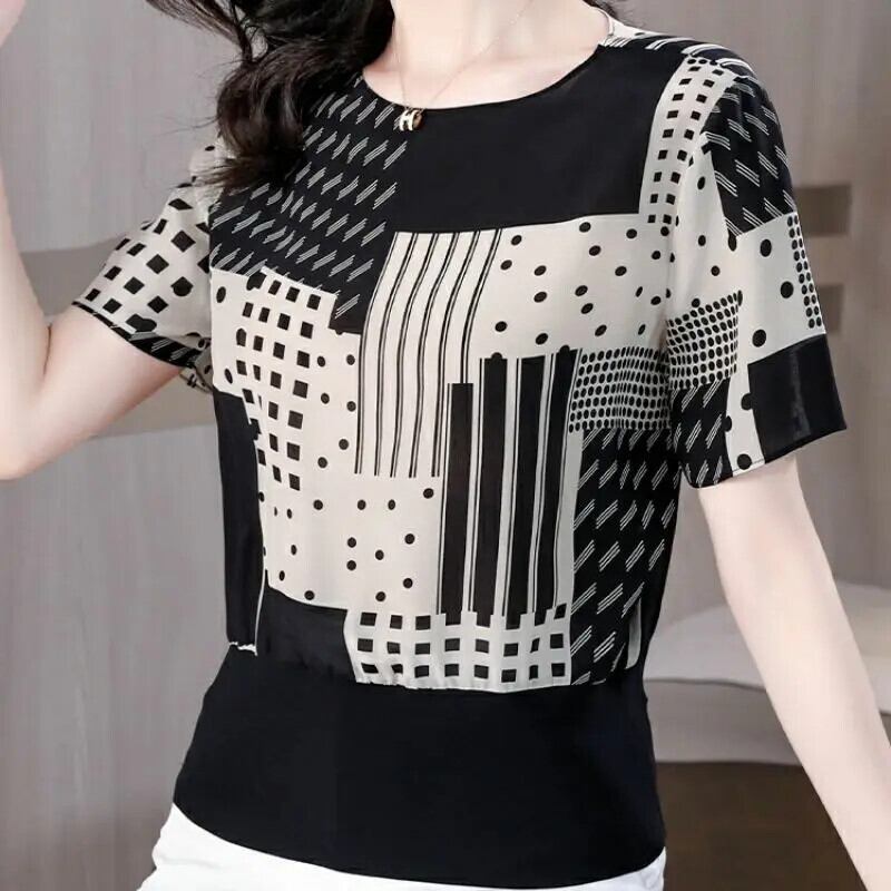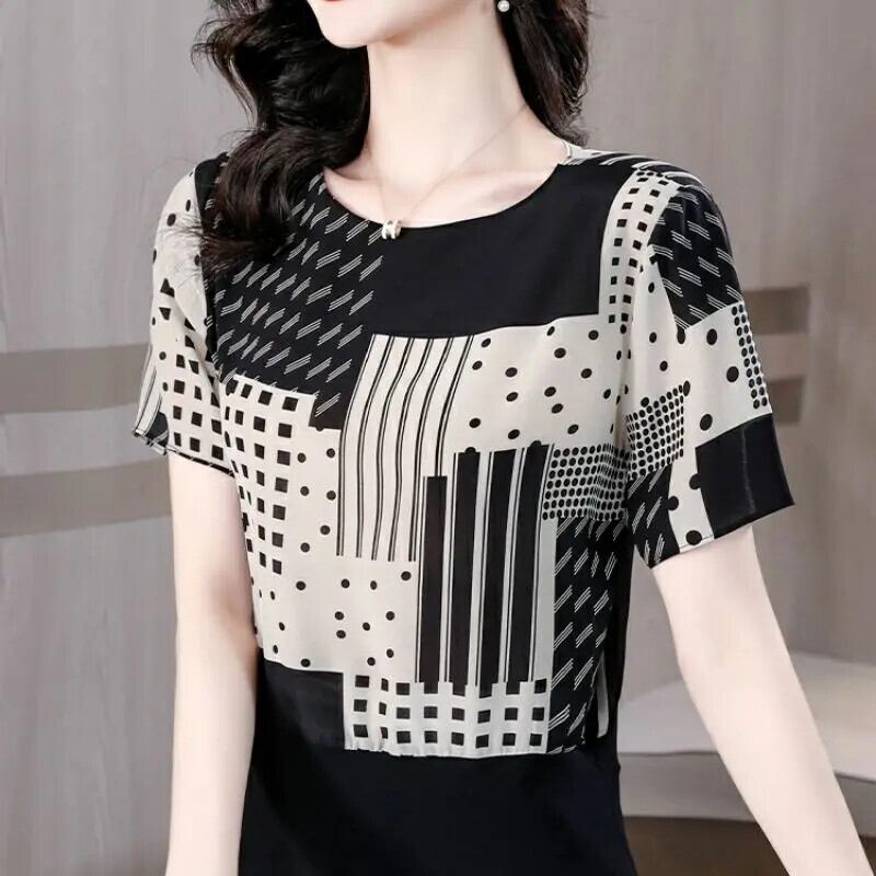 送料無料 ヴィンテージプリント O ネックスプライシング半袖ブラウス女性の 2023 夏特大プルオーバー通勤シャツ ショート ハーフスリーブ サマー 夏物 Oネック ビンテージ AE1288776623280435075
