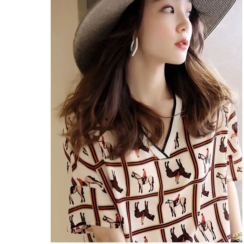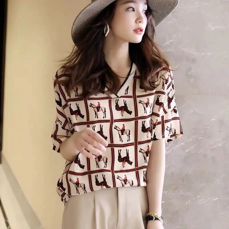 送料無料 ヴィンテージプリントスプライス V ネックルーズブラウス女性の 2023 夏プルオーバー半袖シャツ ショート ハーフスリーブ サマー 夏物 Vネック ビンテージ AE1288776635594428877