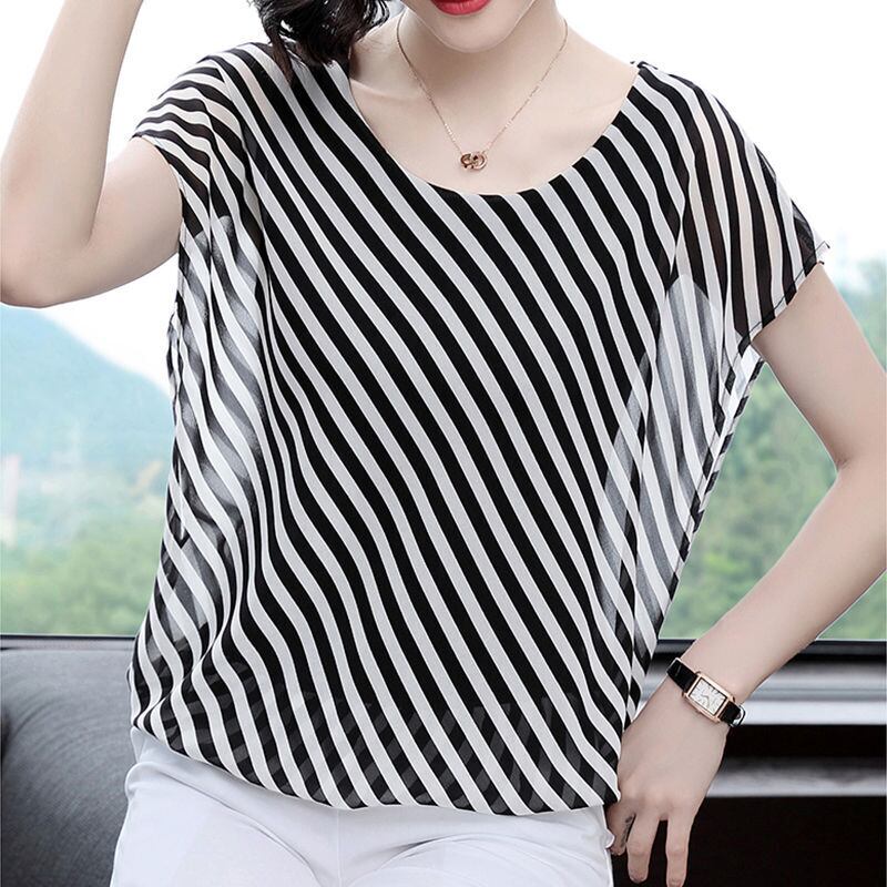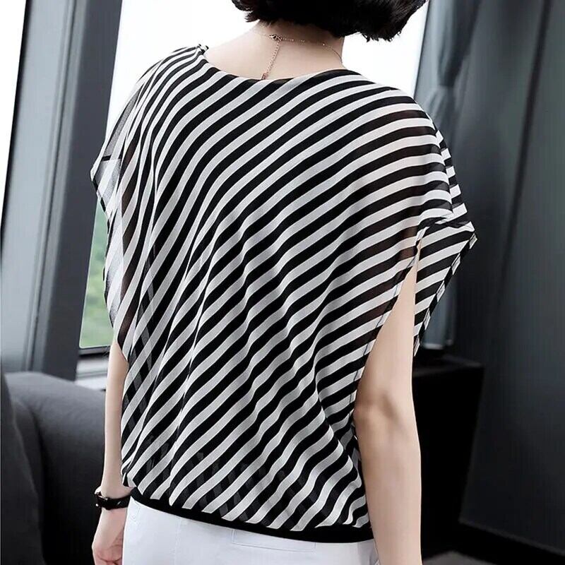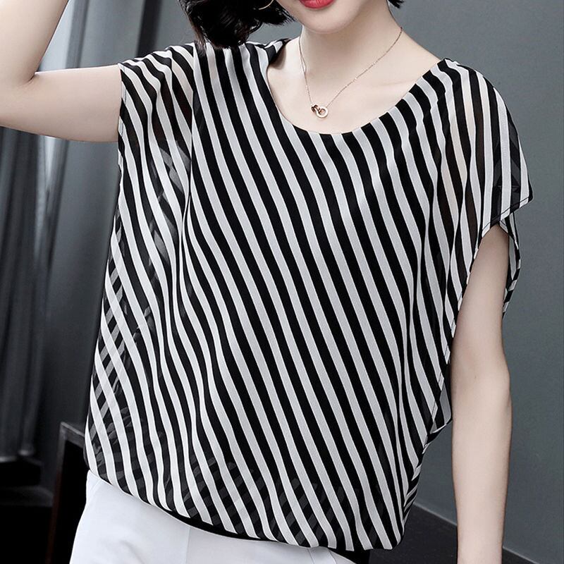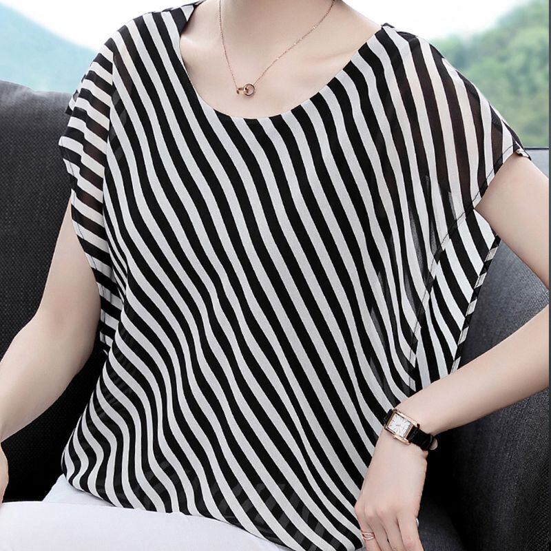 送料無料 O ネックオールマッチバットウィングスリーブストライプブラウス女性の 2023 夏プルオーバーシフォンシャツ サマー 夏物 Oネック AE128877667924491063