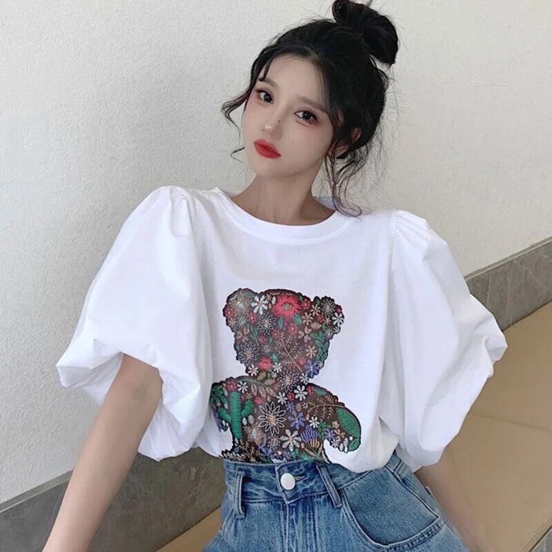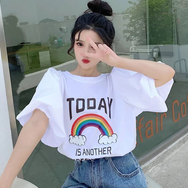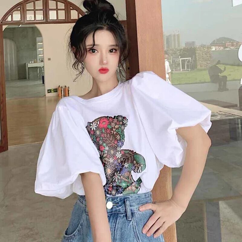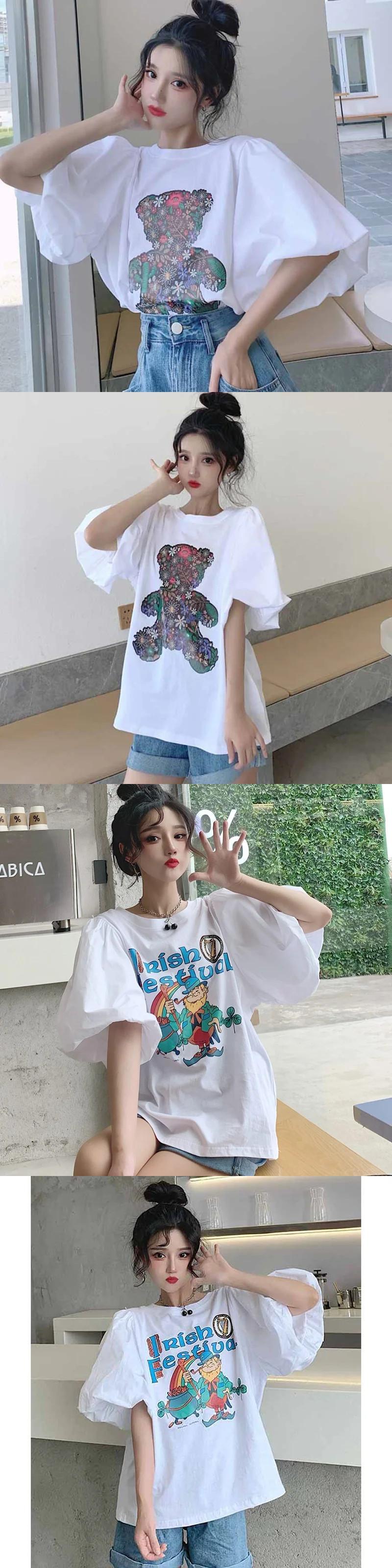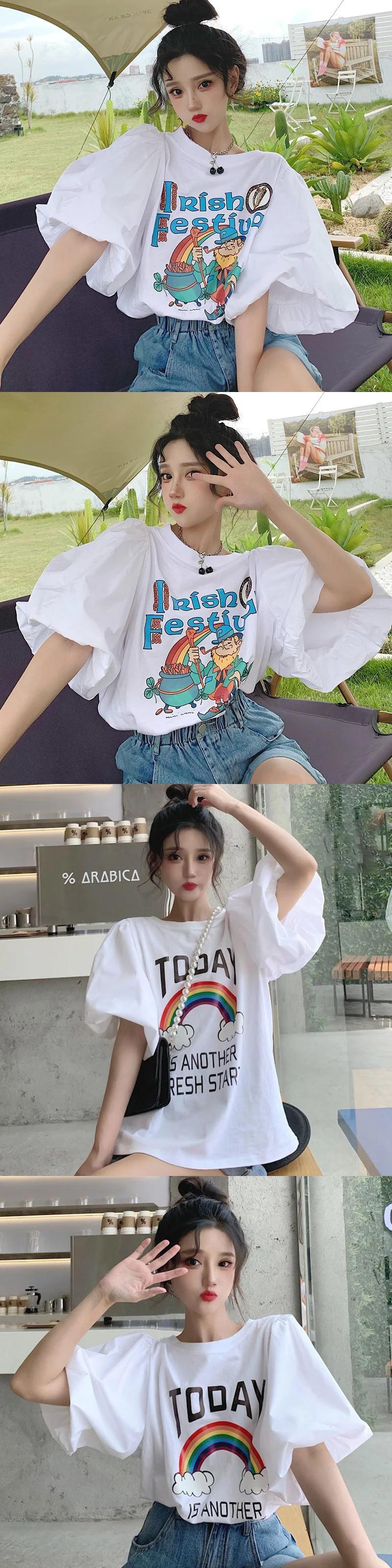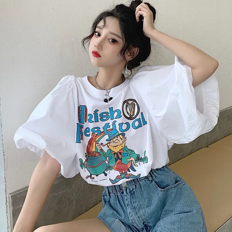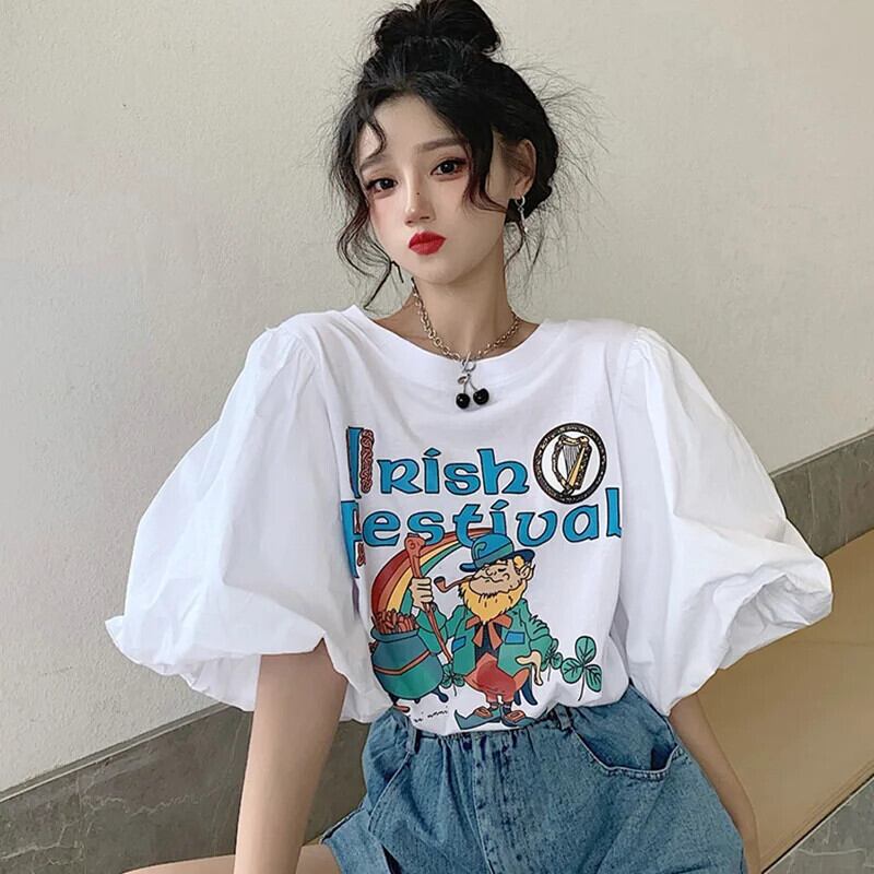 送料無料 スタイリッシュな O ネックルーズプリントひだパフスリーブブラウス 2023 夏プルオーバーオールマッチシャツ サマー 夏物 Oネック AE1288776630489032449