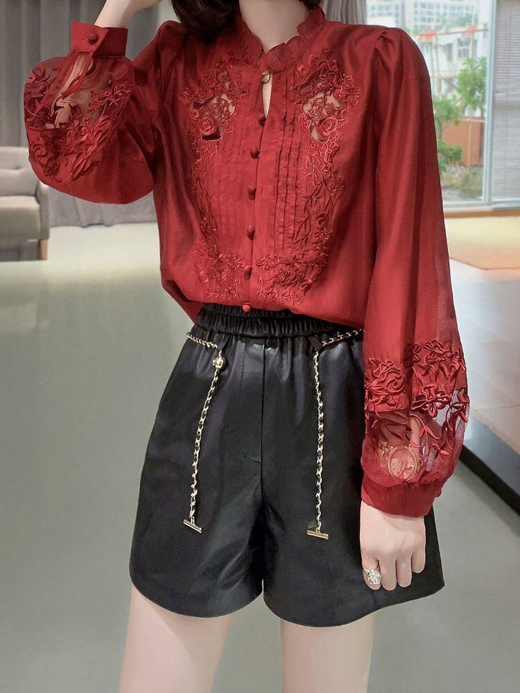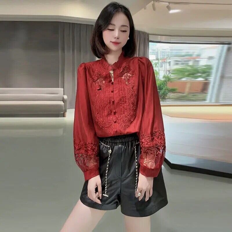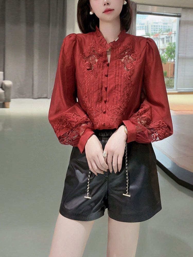 送料無料 中空アウトフリル刺繍ランタンスリーブシャツ女性 2023 秋冬トップスルーズガーゼブラウス ラッフル オータム 秋物 ウィンター 冬物 AE1288776621792529324