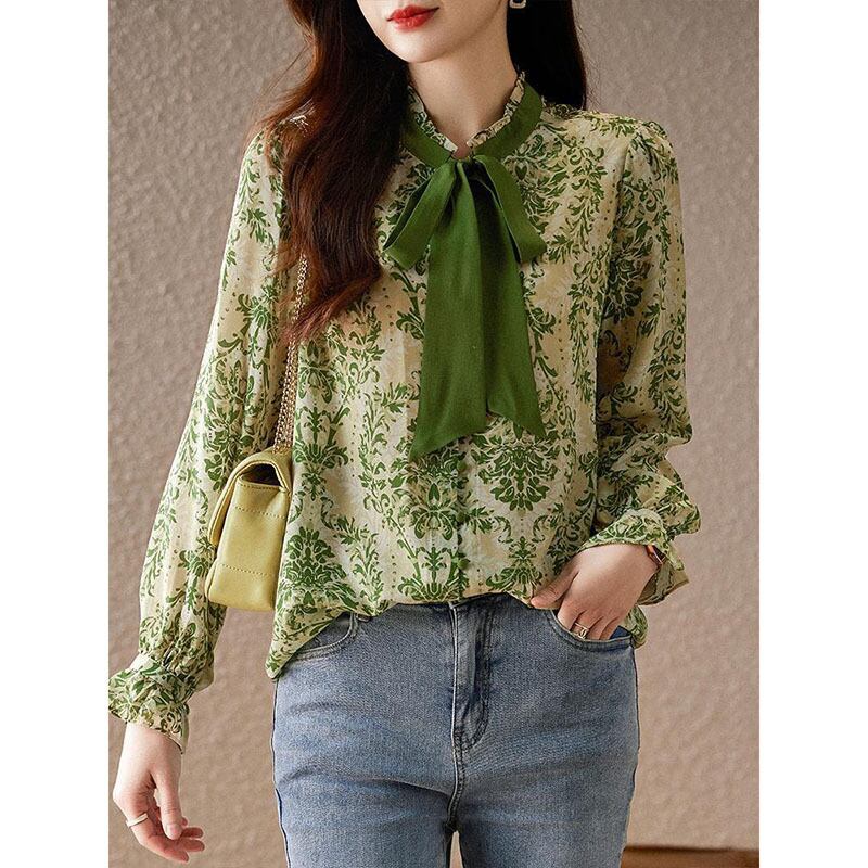 送料無料 ヴィンテージプリントフリルレースアップ弓フレアスリーブシフォンシャツ女性 2023 夏特大トップス通勤ブラウス リボン ラッフル サマー 夏物 ビンテージ AE1288776695984587203