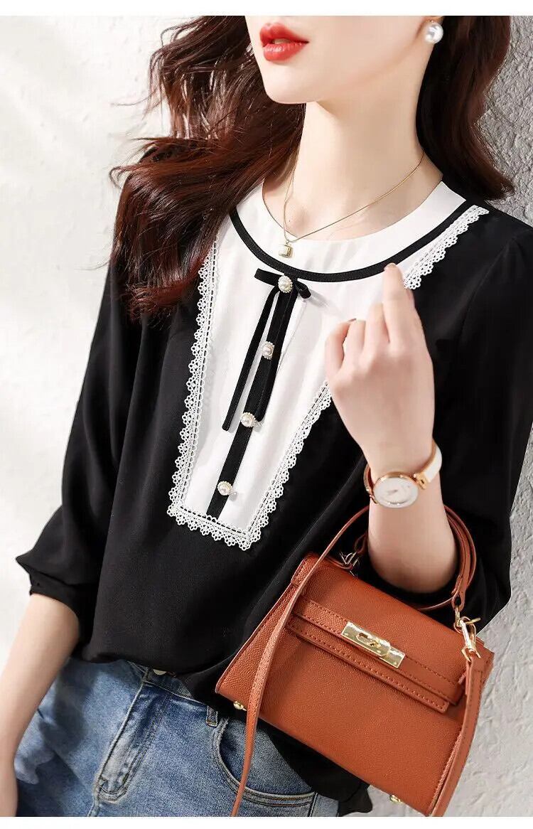 送料無料 O ネックスプライシングレースビーズリボンブラウス女性の 2023 秋冬ルーズプルオーバー通勤シャツ オータム 秋物 ウィンター 冬物 Oネック AE1288776697682773685