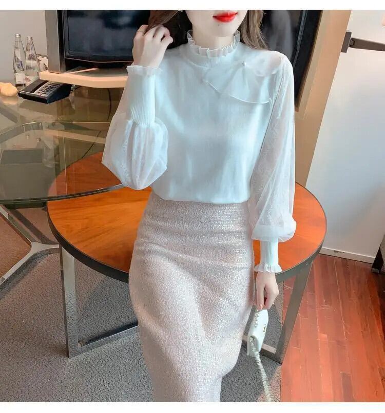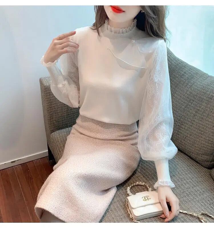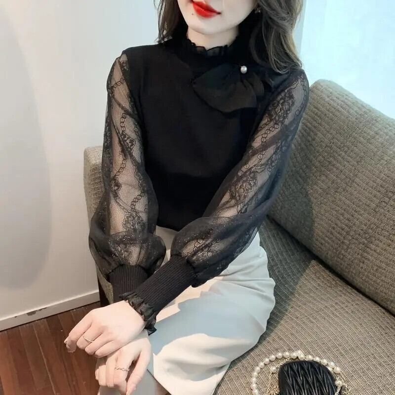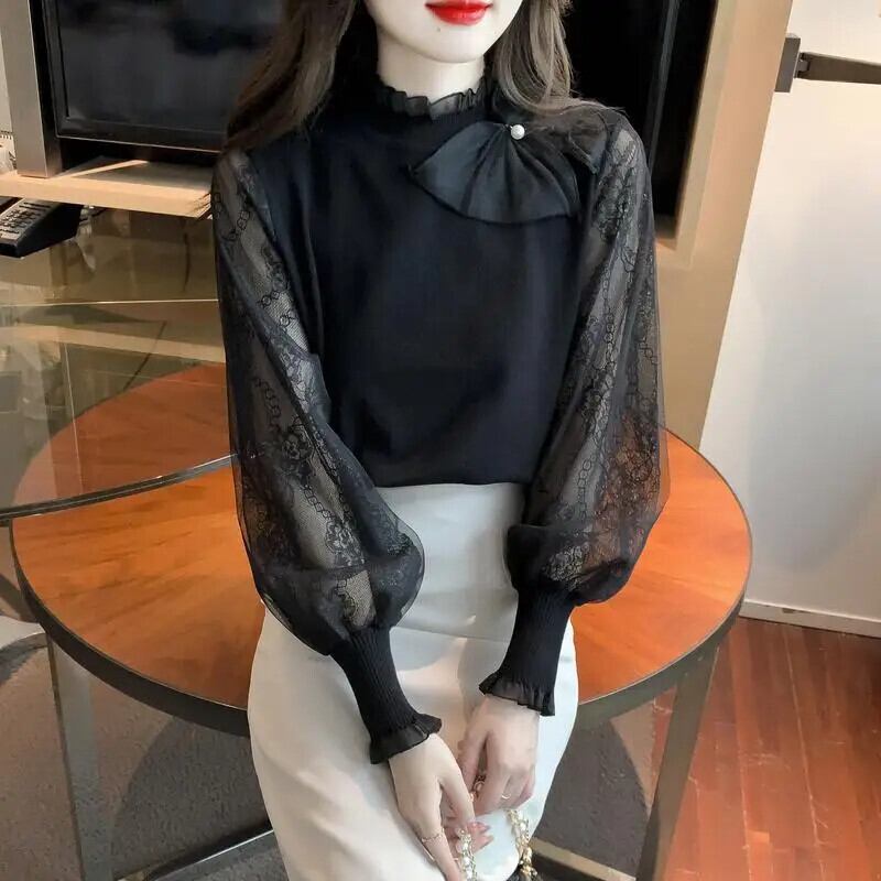 送料無料 スプライシングフリルボウガーゼランタンスリーブブラウス女性の 2024 春ルーズトップスオフィスレディシャツ リボン ラッフル スプリング 春物 会社 学校 通勤や通学にも AE1288776661708327191