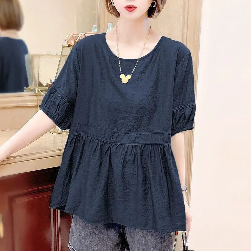 送料無料 O ネックスプライシングルーズ半袖折り目ブラウス女性の 2023 夏プルオーバーオールマッチシャツ ショート ハーフスリーブ サマー 夏物 Oネック AE128877669091230619