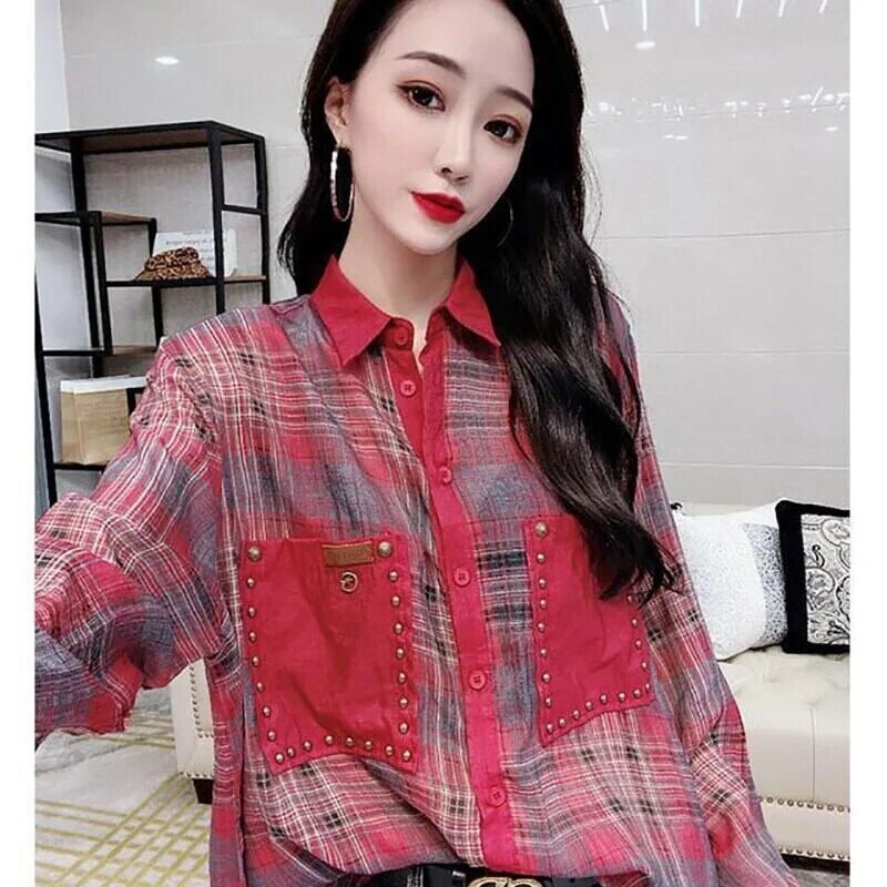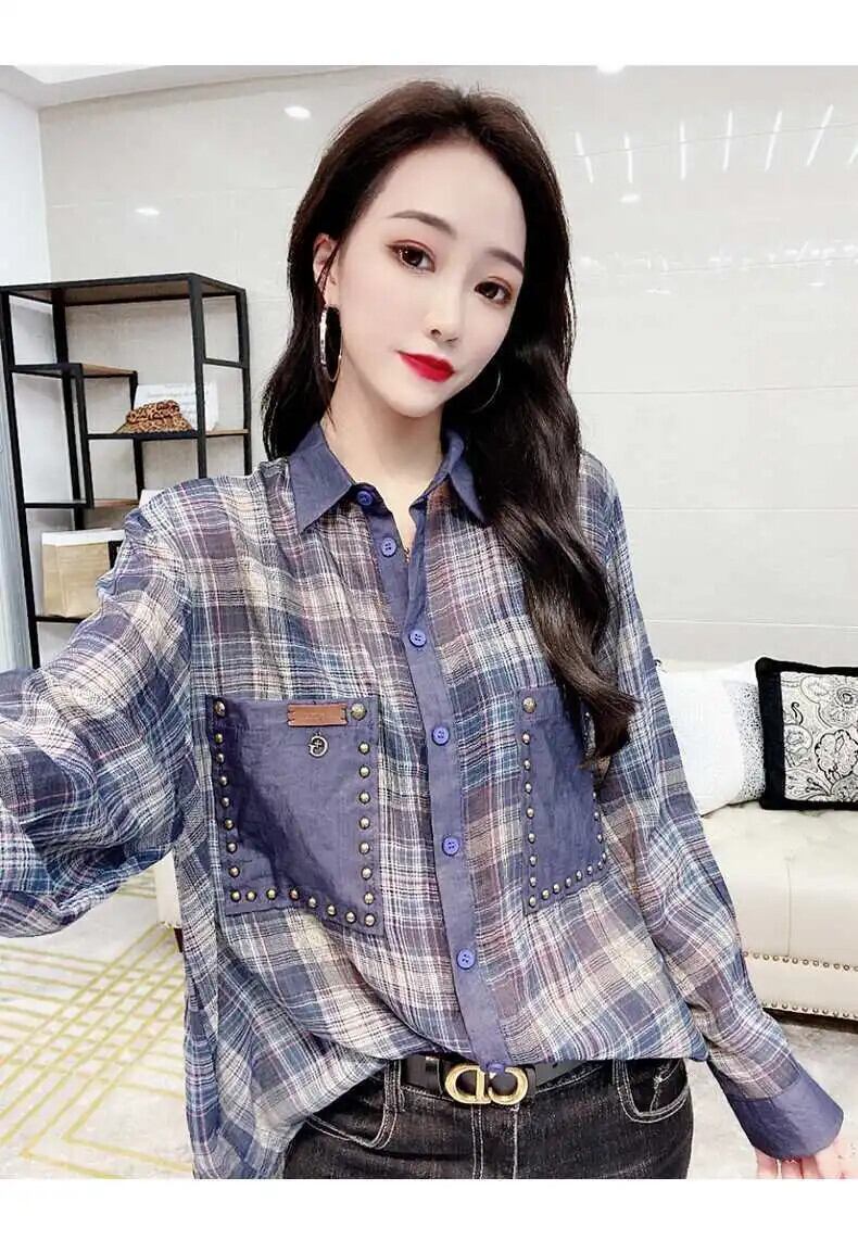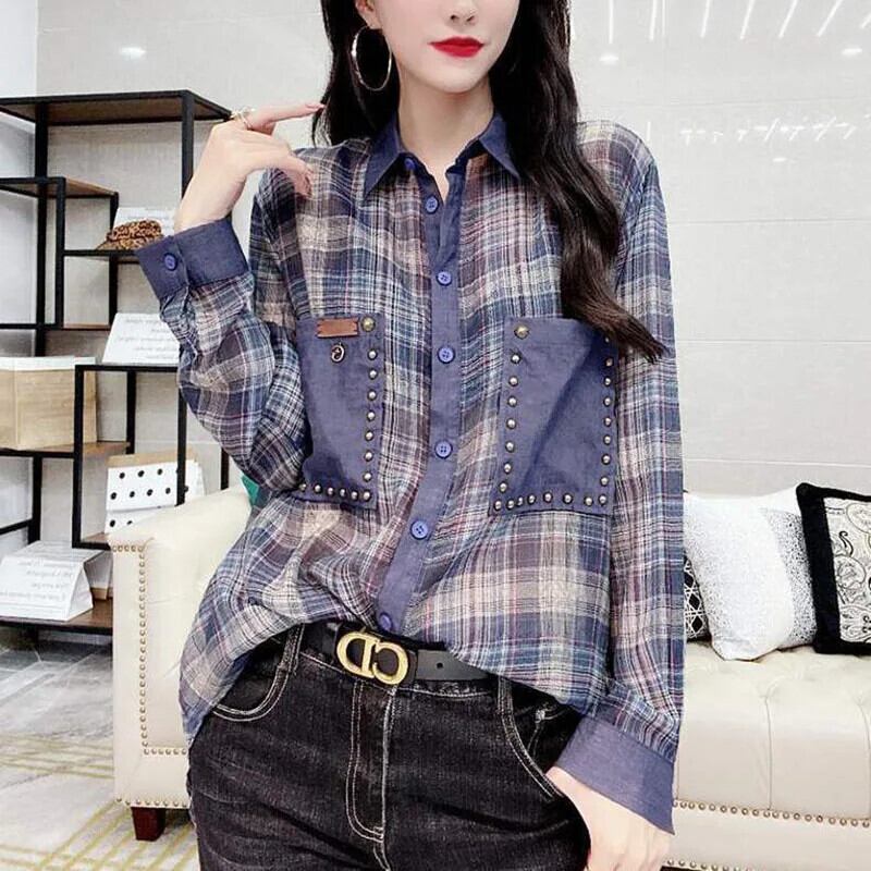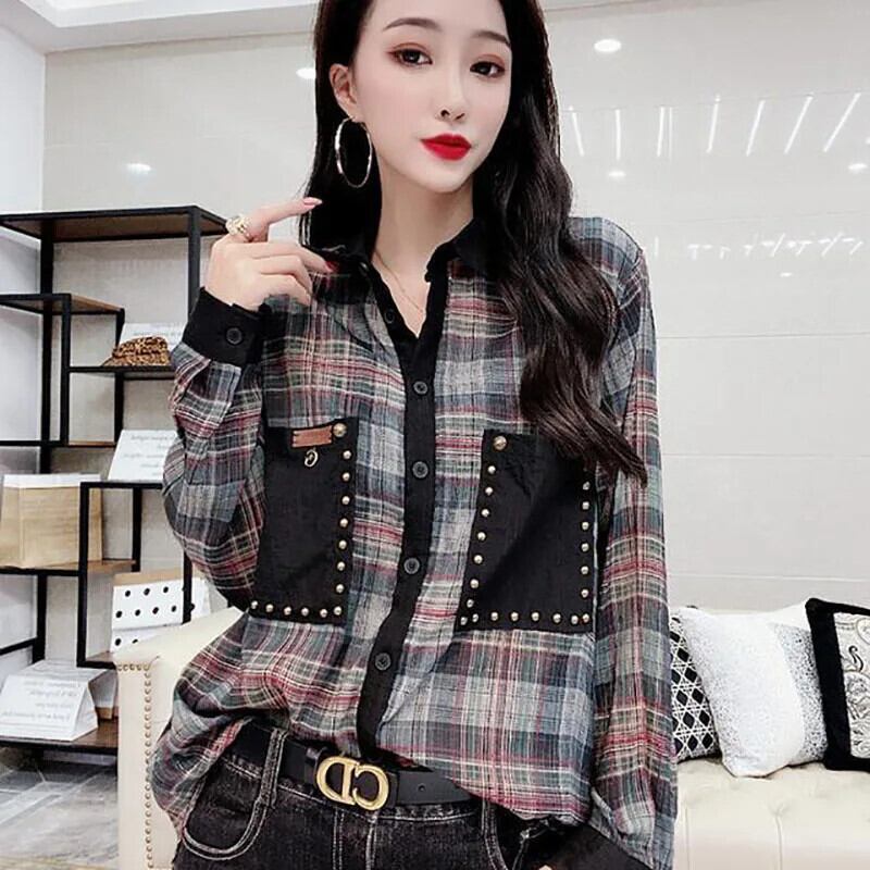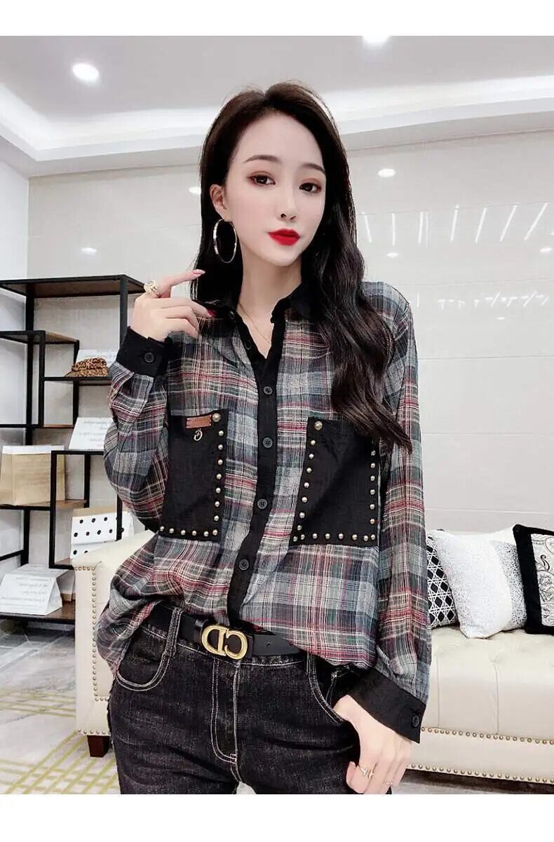 送料無料 ヴィンテージプリントビーズポケットチェック柄シャツ女性の 2023 秋トップスルーズブラウス オータム 秋物 ビンテージ AE1288776698319078232