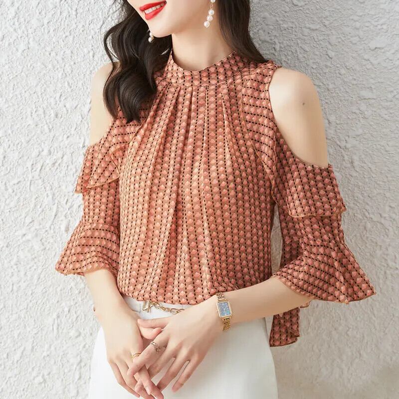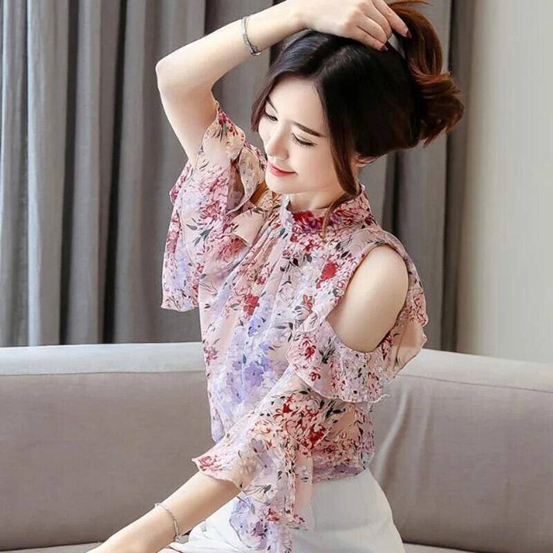 送料無料 ヴィンテージプリントバタフライスリーブオーバーサイズオフショルダーシフォンブラウス夏トップス女性の通勤シャツ サマー 夏物 ビンテージ AE1288776633071016791