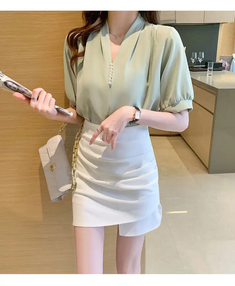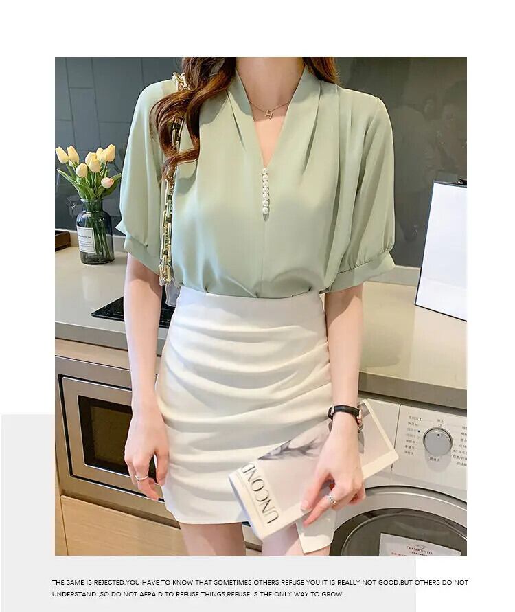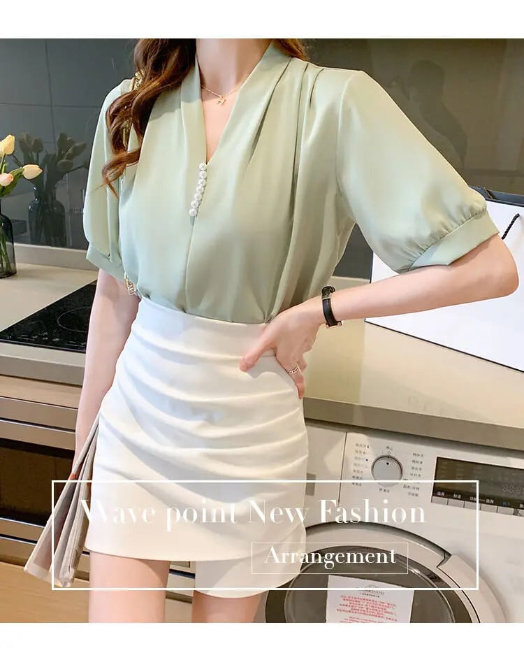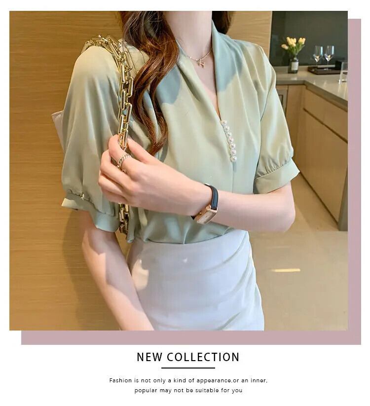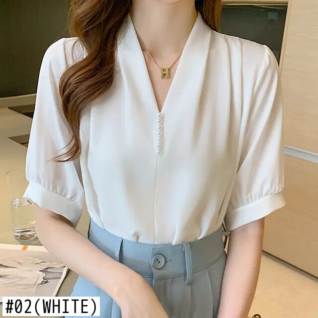 送料無料 ビーズパフ半袖Vネックシフォンシャツレディース2022春オフィスレディゆったりプルオーバーブラウス ショート ハーフスリーブ スプリング 春物 会社 学校 通勤や通学にも AE1288776632701199373