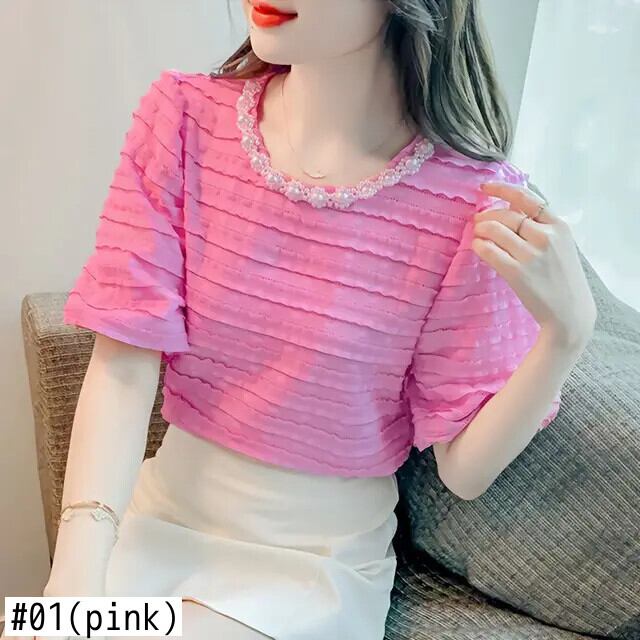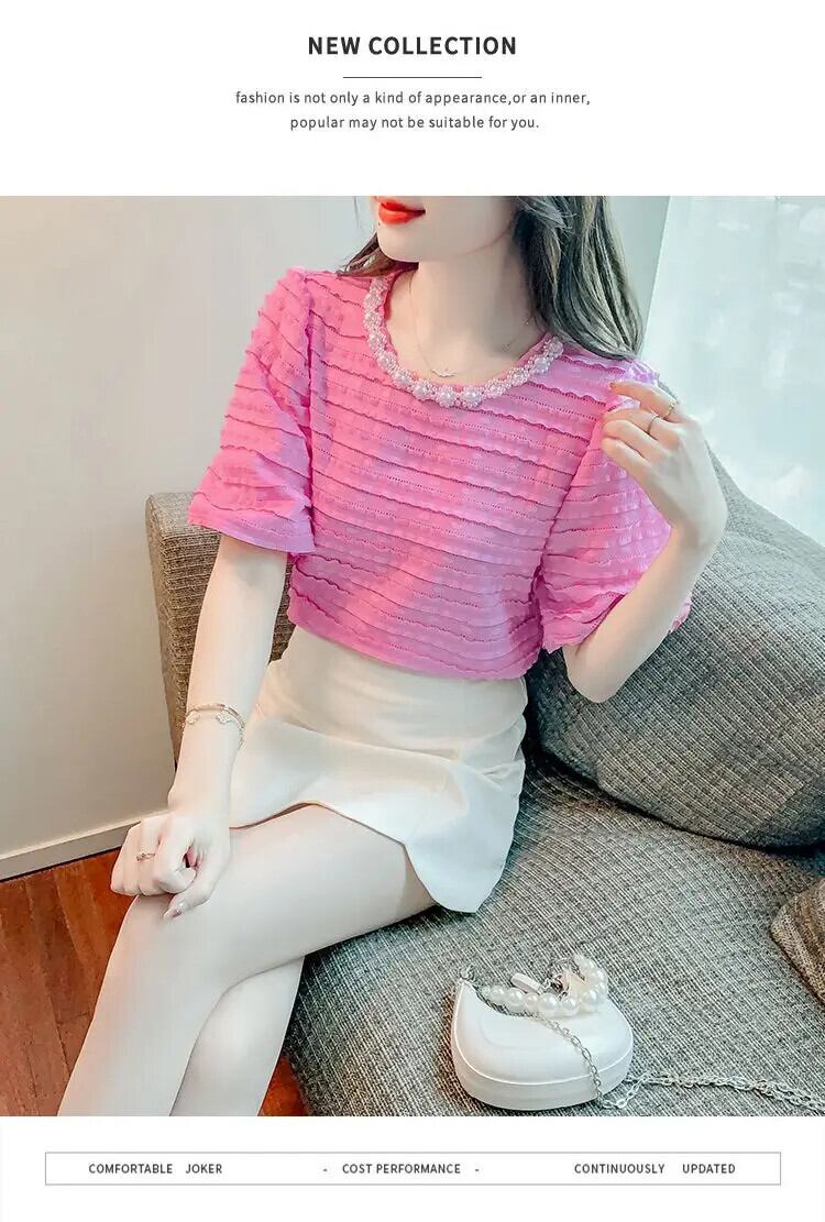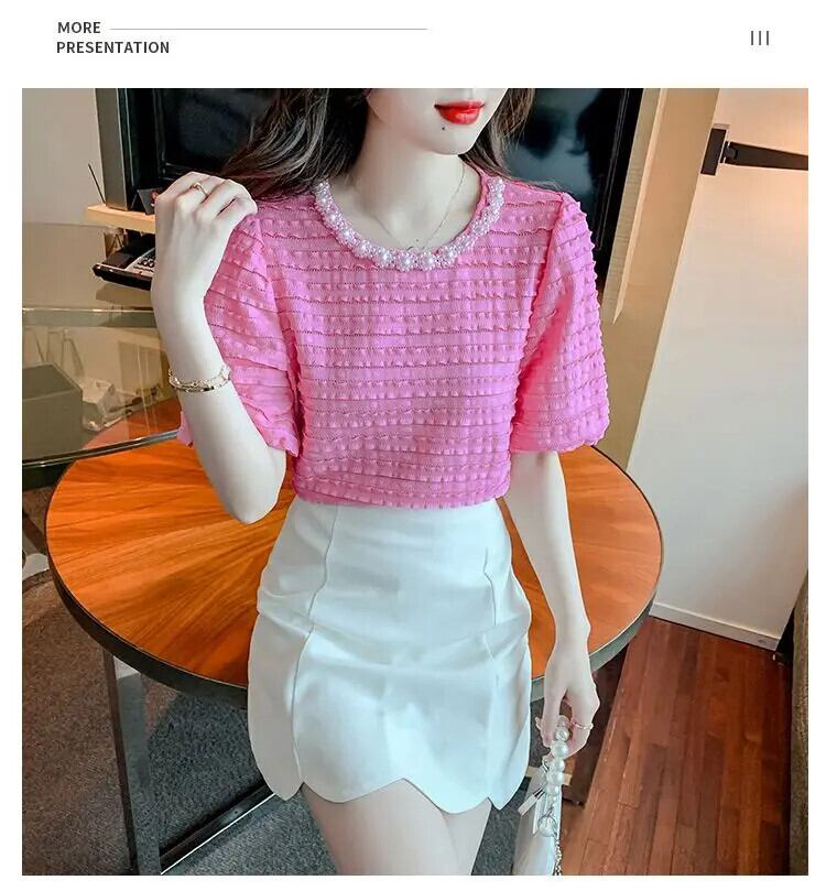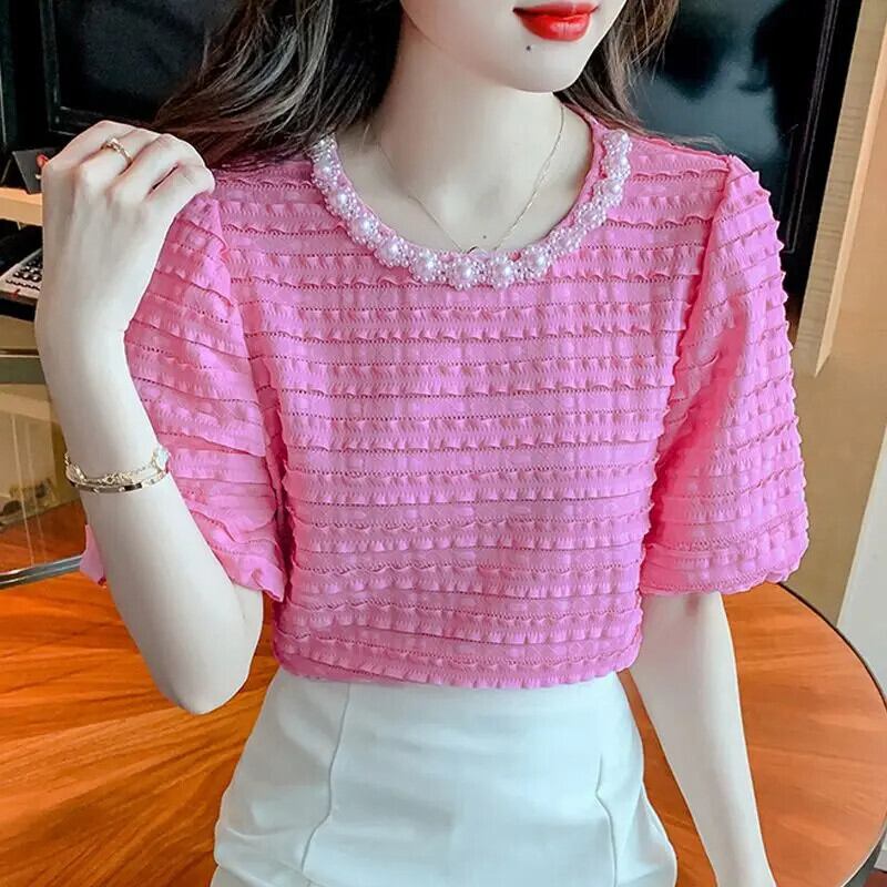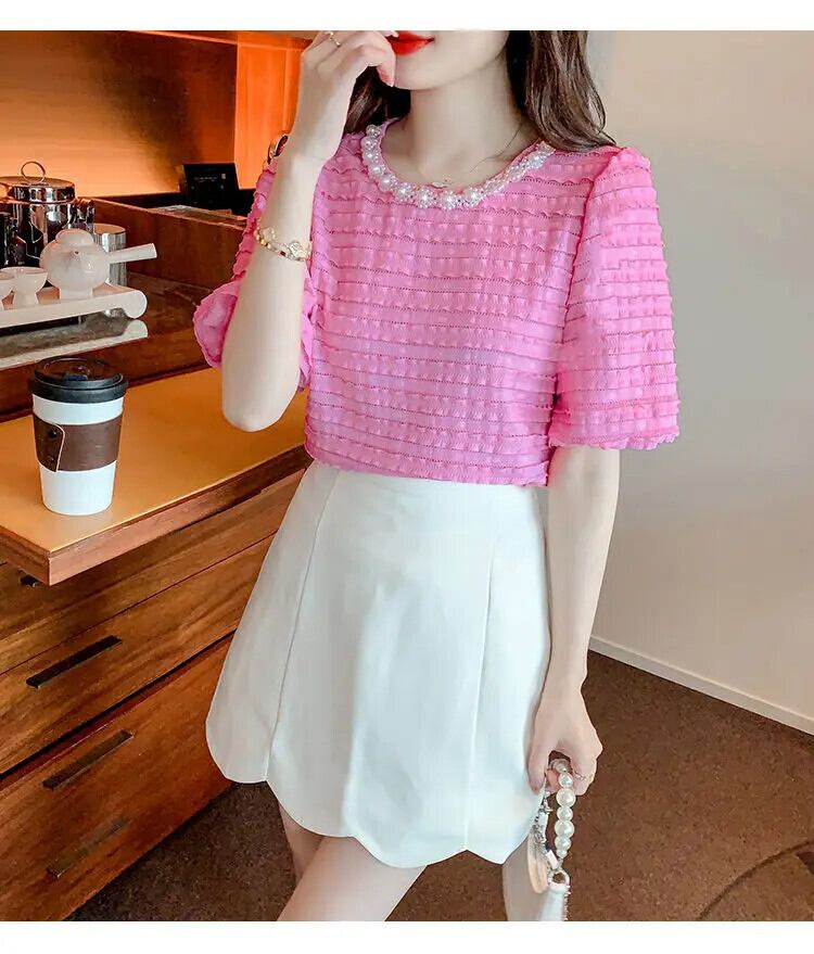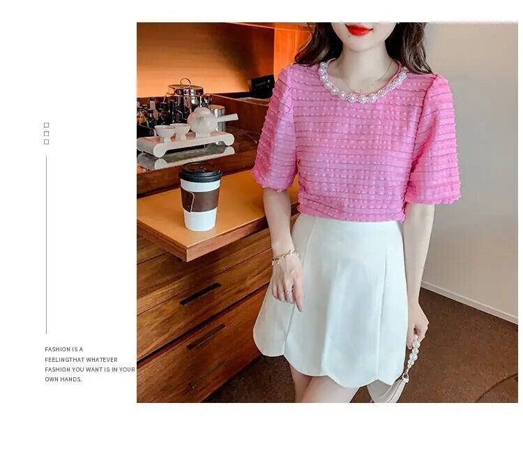 送料無料 ソリッドカラーフリルパフスリーブビーズブラウス女性の 2024 夏ルーズトップスオフィスレディシャツ ラッフル サマー 夏物 会社 学校 通勤や通学にも AE1288776647791532650