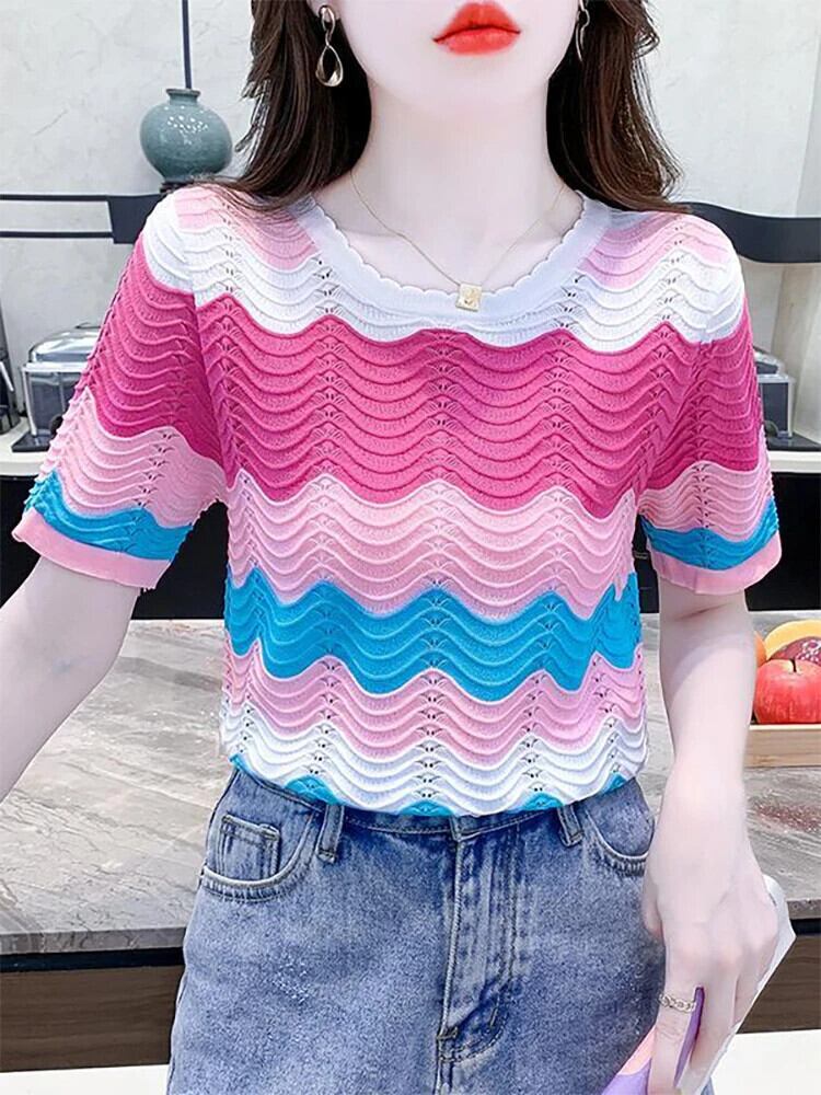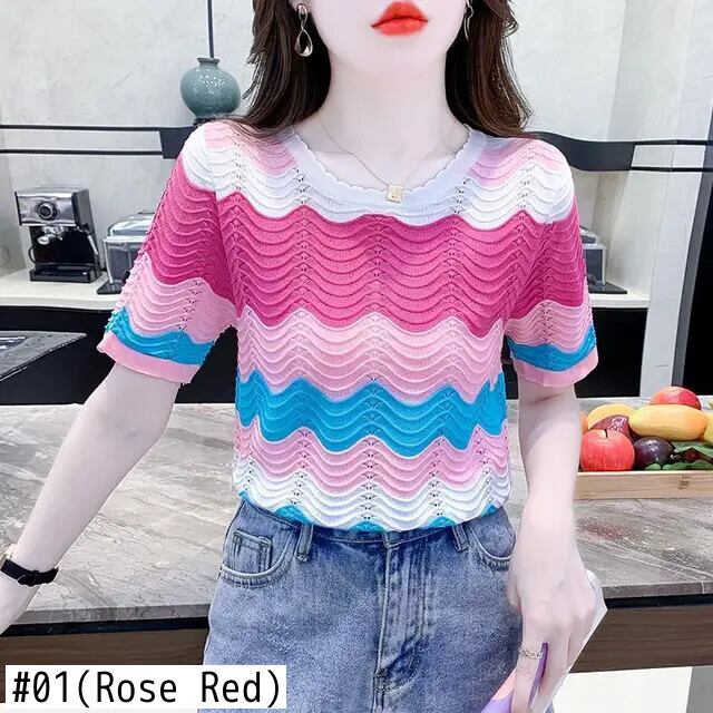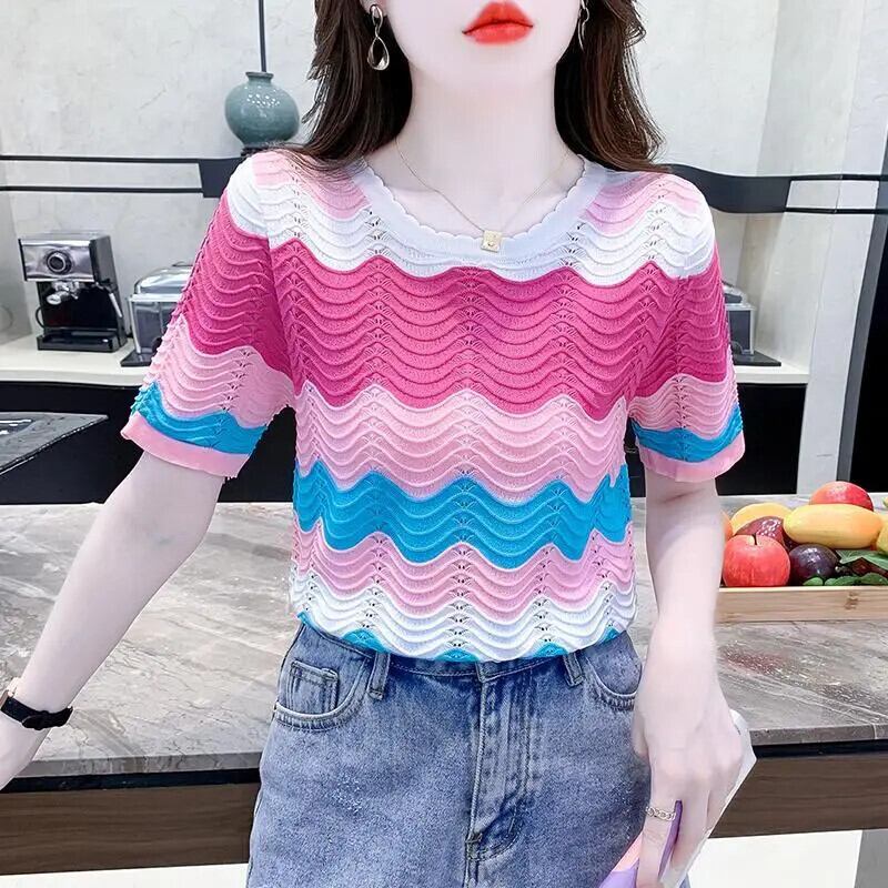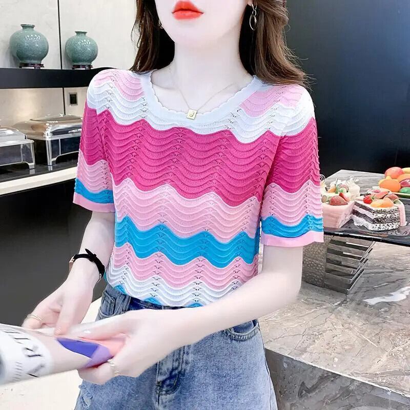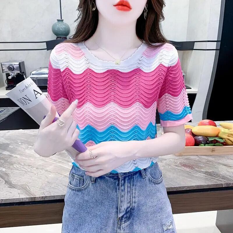 送料無料 O ネックストライプニット中空アウトカラーブラウス女性の 2024 夏ルーズオールマッチトップス甘いシャツ 大人ガーリー スウィート キュート カジュアル サマー 夏物 Oネック AE1288776678596071325