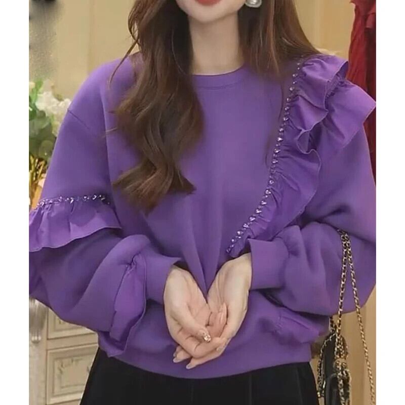 送料無料 O ネックスプライスビーズフリルブラウス女性の 2023 秋冬特大プルオーバー通勤シャツ ラッフル オータム 秋物 ウィンター 冬物 Oネック AE1288776685960410384