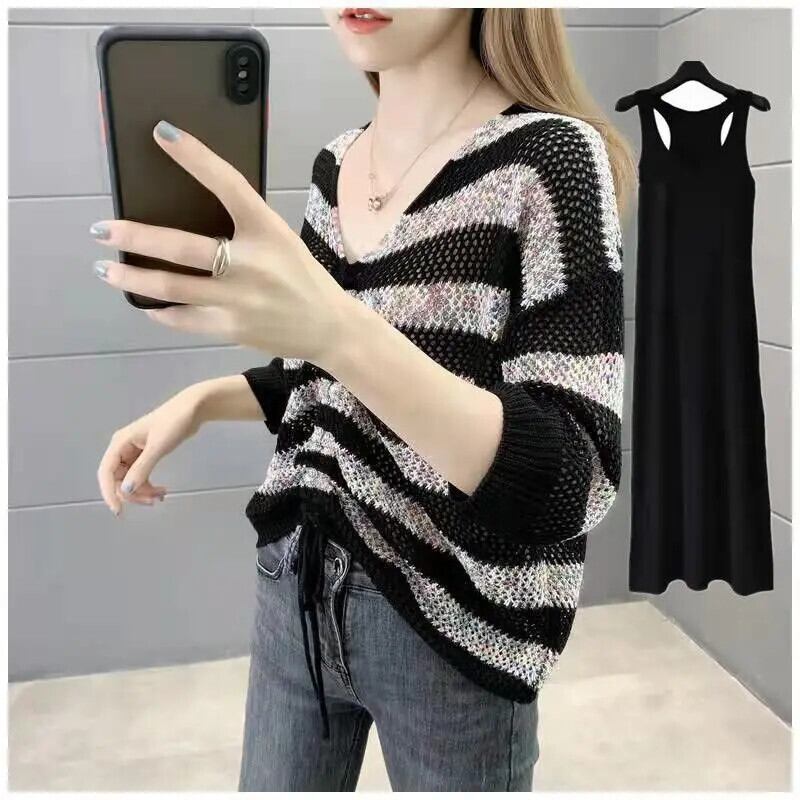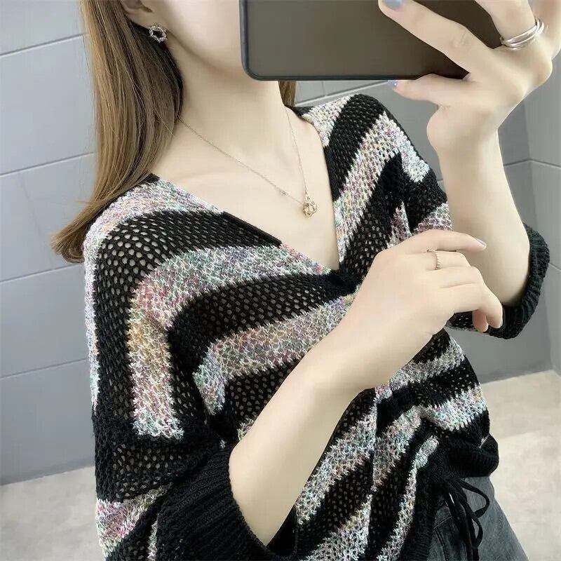 送料無料 V ネック中空アウトシャーリング包帯リボンストライプブラウス 2023 夏プルオーバートップスシャツ サマー 夏物 Vネック AE1288776620868839105