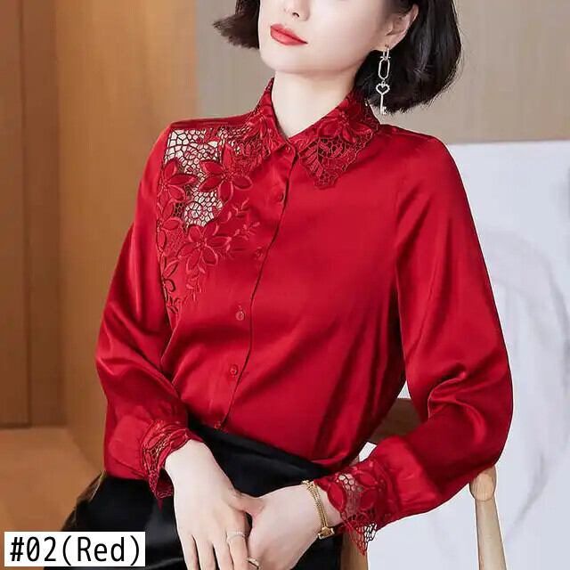 送料無料 ソリッドカラー中空刺繍サテンシャツ女性の 2023 春トップスオールマッチオフィスレディブラウス スプリング 春物 会社 学校 通勤や通学にも AE1288776672915201868