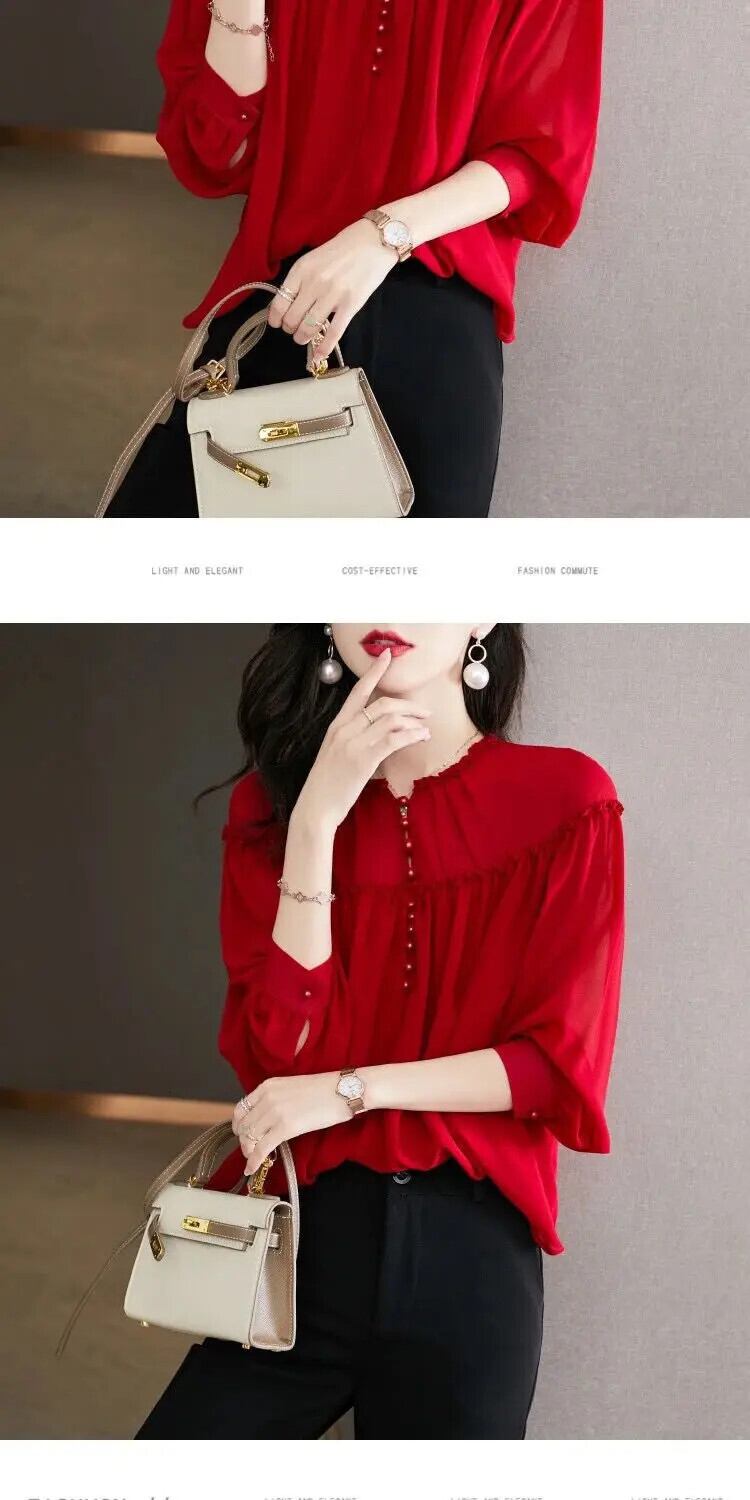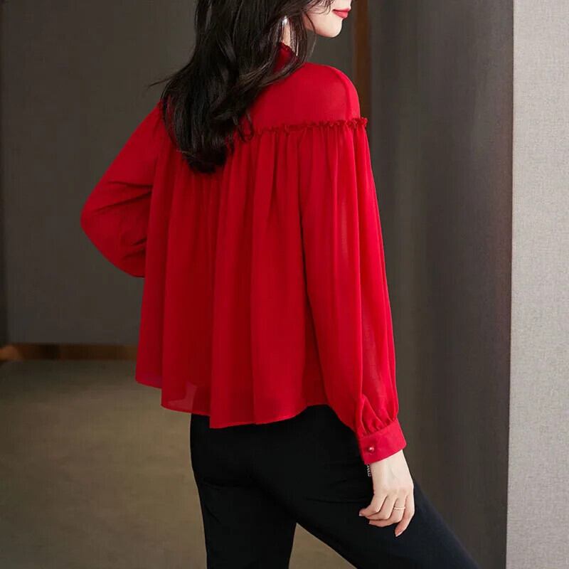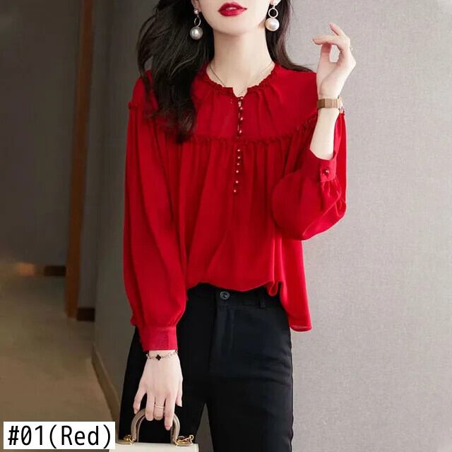 送料無料 ソリッドカラースプライシングフリルボタン折りブラウス女性 2022 秋プルオーバールーズオフィスレディシャツ ラッフル オータム 秋物 会社 学校 通勤や通学にも AE1288776685001195689