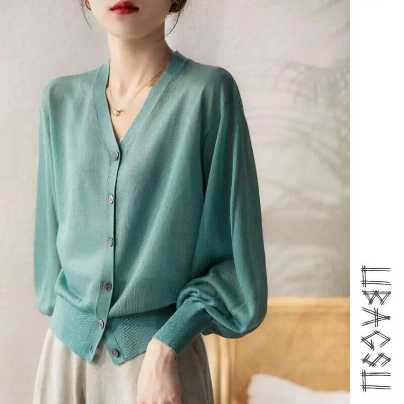 送料無料 スタイリッシュな V ネックボタンニットランタンスリーブシャツ女性 2022 秋ルーズトップスオールマッチ通勤ブラウス オータム 秋物 Vネック AE1288776668140603292