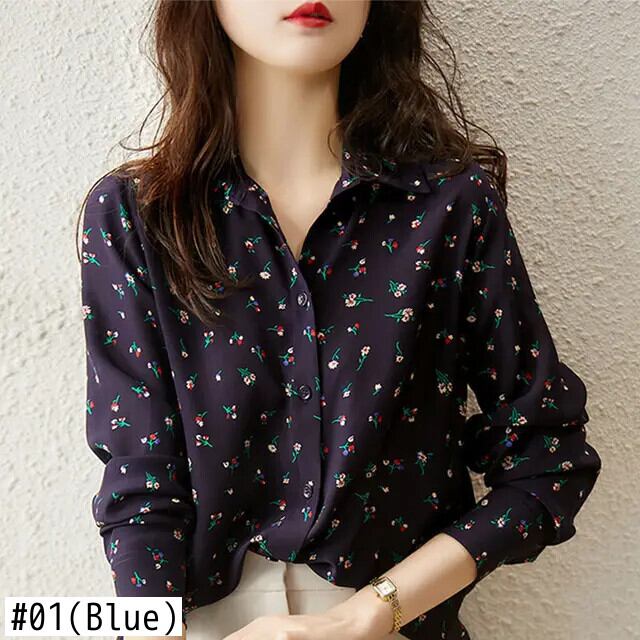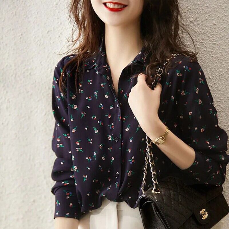 送料無料 ヴィンテージプリントラペルボタン花柄シャツ女性 2022 秋ルーズトップス長袖オールマッチ通勤ブラウス ロング オータム 秋物 ビンテージ AE1288776660611791851