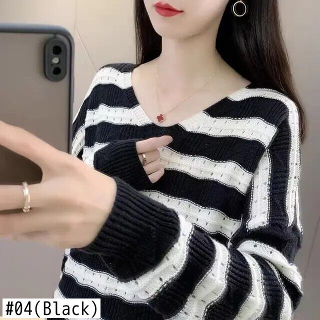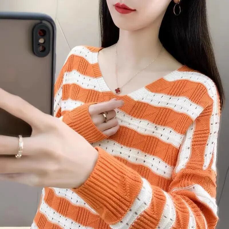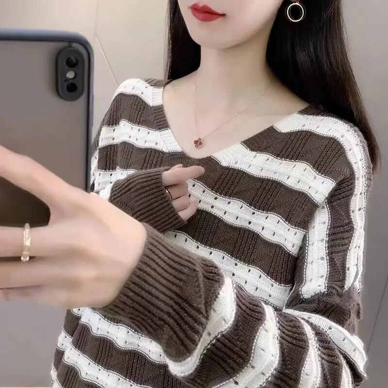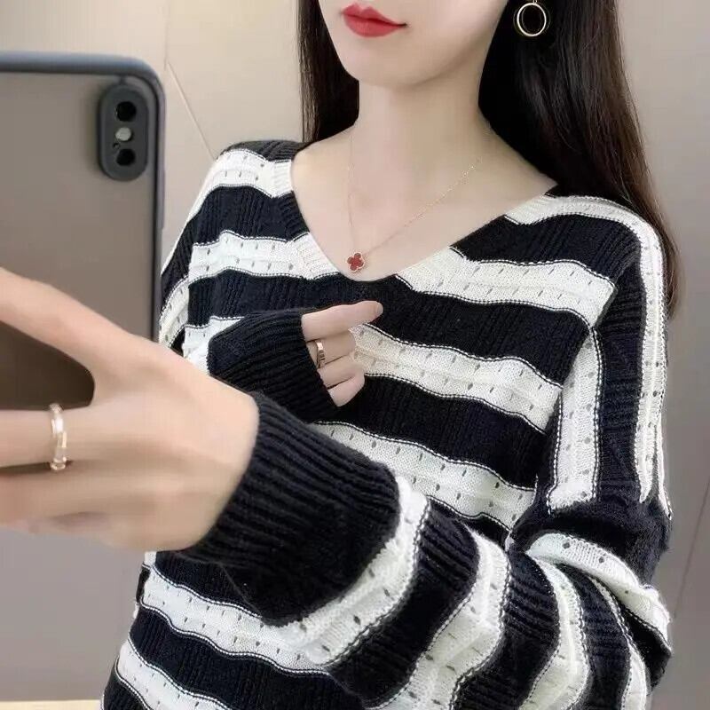 送料無料 V ネックルーズ中空アウトストライプブラウス女性の 2023 秋冬特大プルオーバーシャツ オータム 秋物 ウィンター 冬物 Vネック AE1288776630016417614