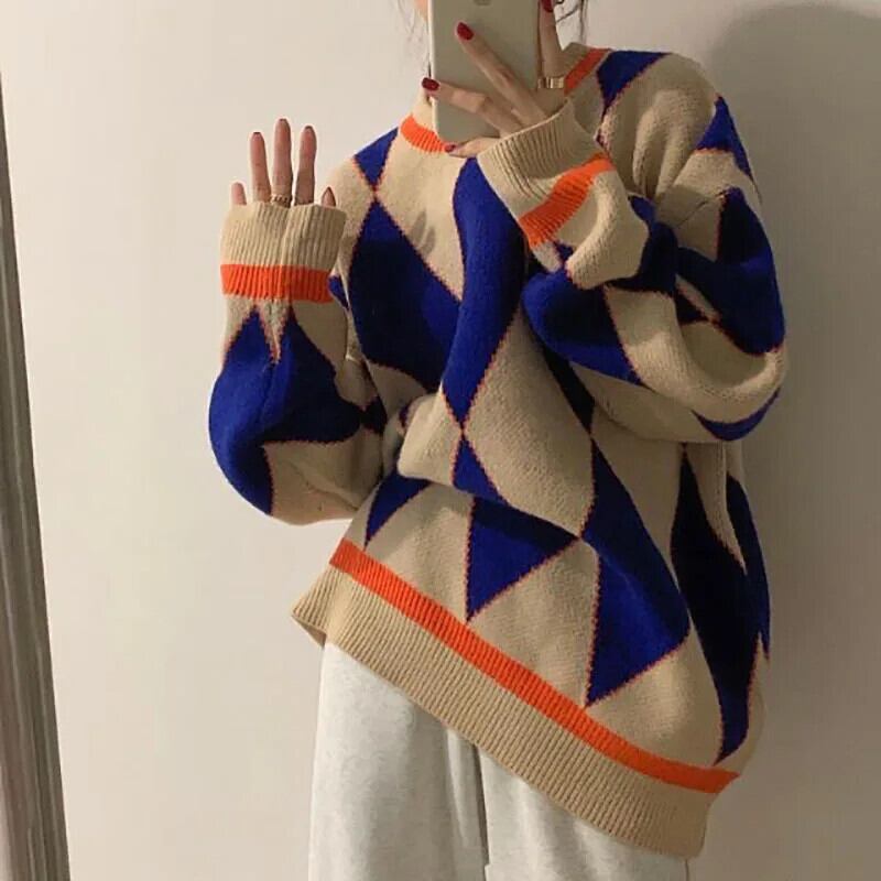 送料無料 O ネックスプライシングルーズチェック柄カラーセーター女性の 2023 冬プルオーバーオールマッチニットトップス ウィンター 冬物 Oネック AE1288776698238963448