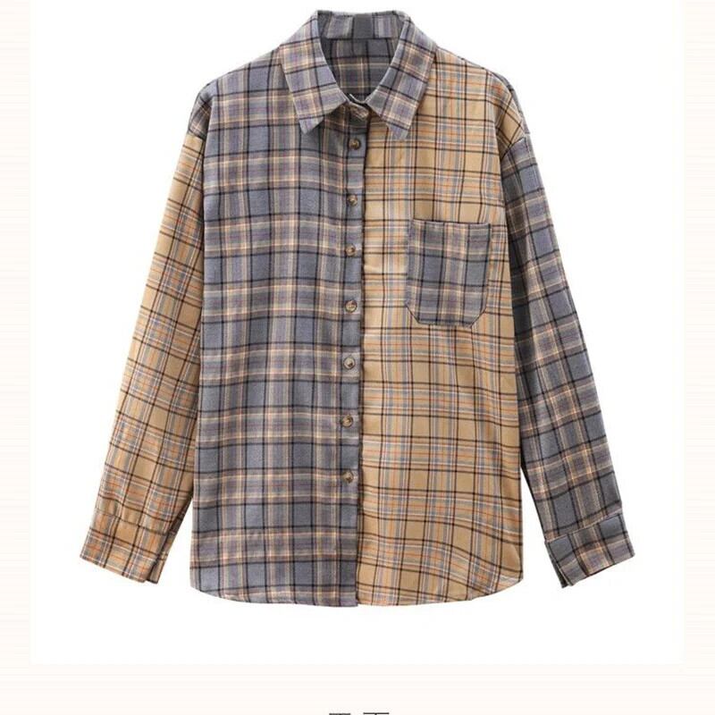 送料無料 ラペルボタンポケット折り目スプライスチェック柄シャツ女性の 2023 秋冬ルーズ通勤トップスブラウス オータム 秋物 ウィンター 冬物 AE1288776641244251513