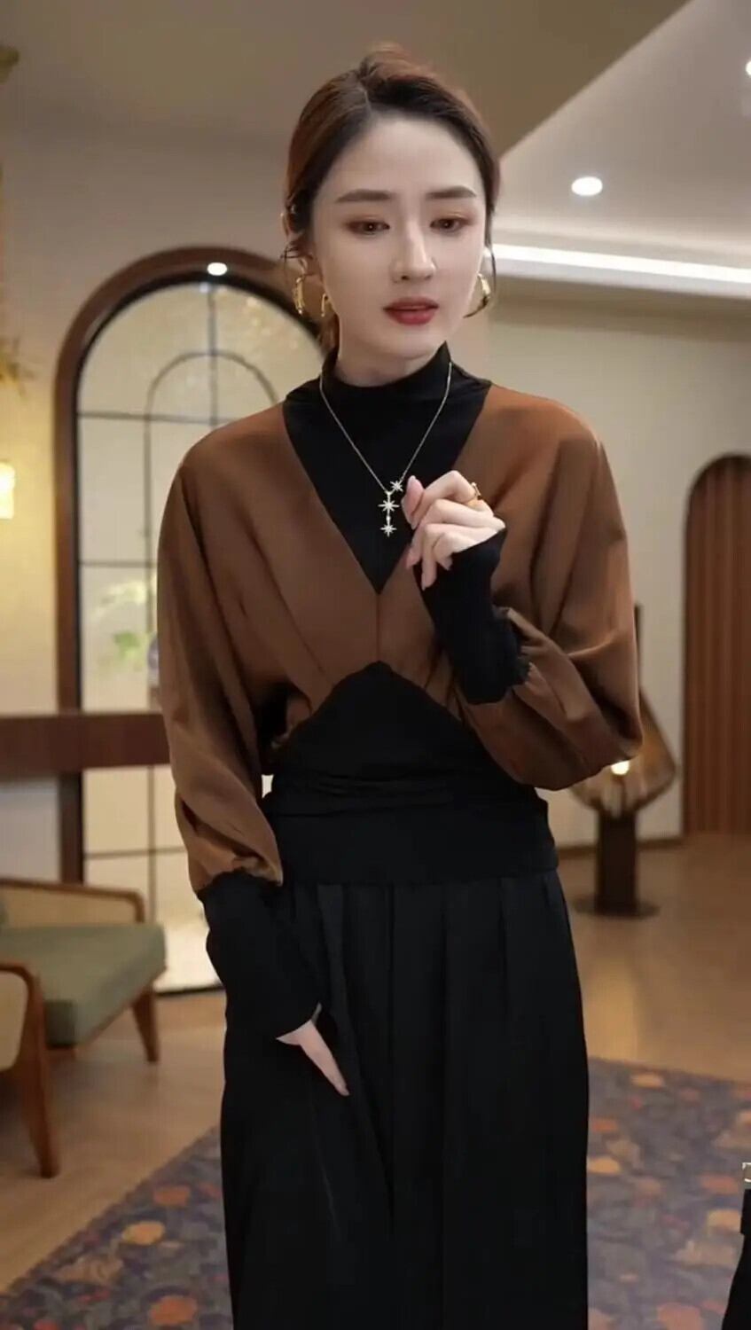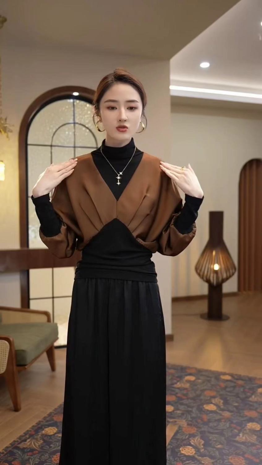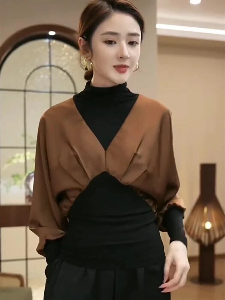 送料無料 スプライス折り目フェイクツーピースブラウス女性の 2023 秋冬ルーズトップスバットウィングスリーブシャツ オータム 秋物 ウィンター 冬物 AE1288776639955438749