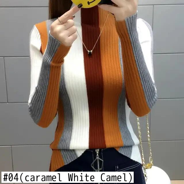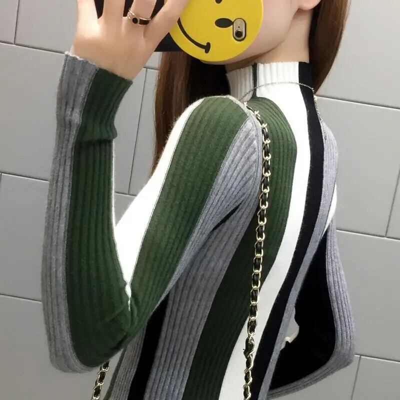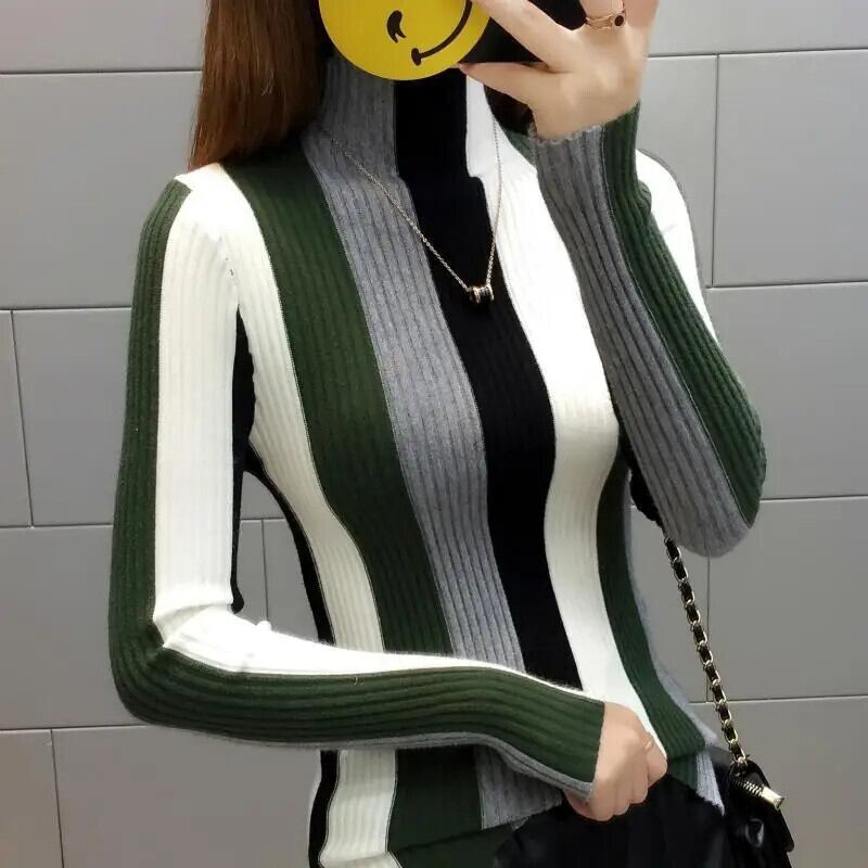 送料無料 スタンドカラーカラーストライプセーター女性の 2023 冬スリムニットプルオーバーオフィスレディ暖かいトップス ウィンター 冬物 会社 学校 通勤や通学にも AE1288776669325115591