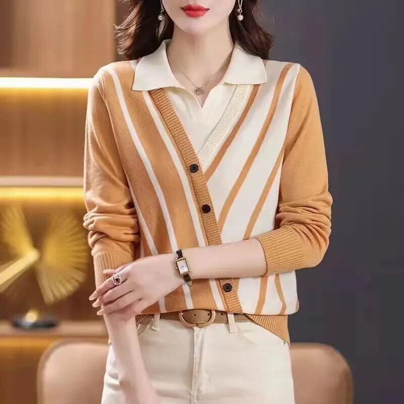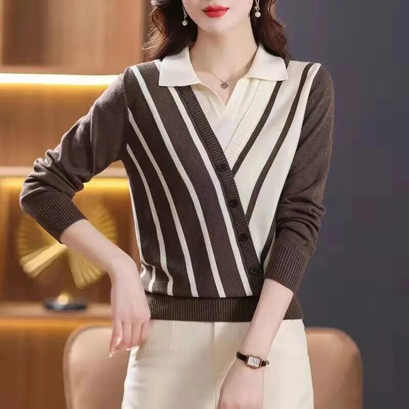 送料無料 スプライスストライプ偽ツーピースセーター女性の 2023 秋冬ルーズプルオーバー非対称トップス オータム 秋物 ウィンター 冬物 AE1288776695549353593