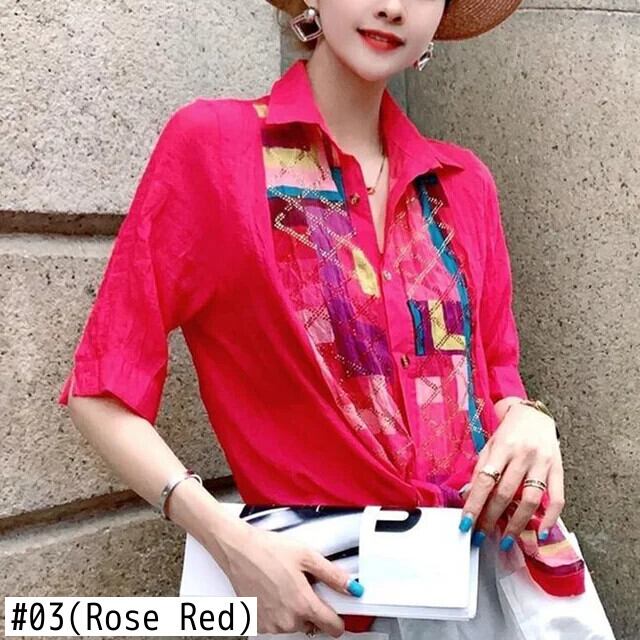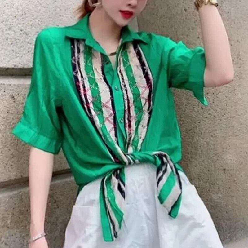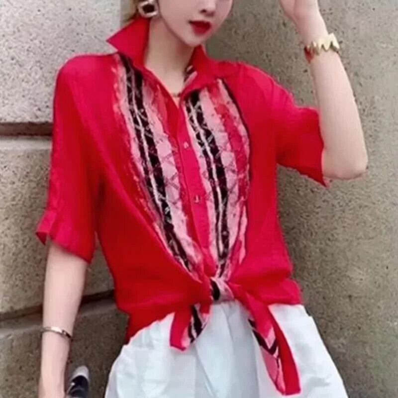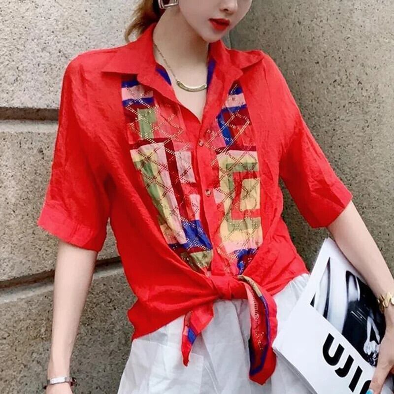 送料無料 ラペルプリントダイヤモンド包帯シャツ 2023 夏ルーズトップス半袖オフィスレディブラウス ハーフスリーブ サマー 夏物 会社 学校 通勤や通学にも AE1288776687525476373