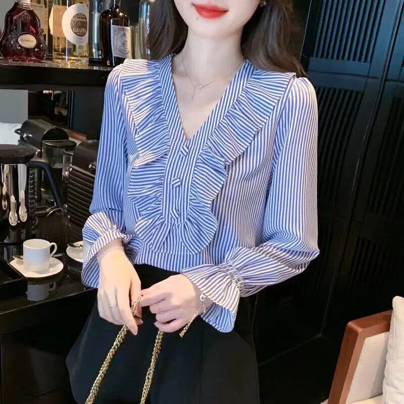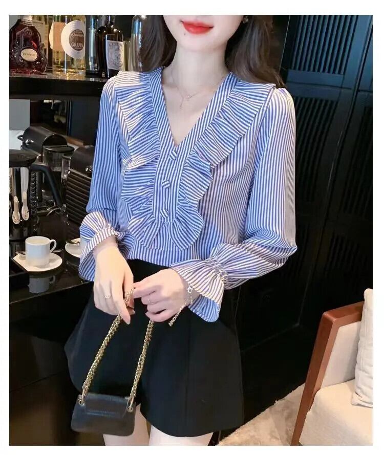 送料無料 プリントフリルストライプフレアスリーブブラウス女性の 2023 秋プルオーバー甘いシャツ ラッフル 大人ガーリー スウィート キュート カジュアル オータム 秋物 AE1288776682941844251